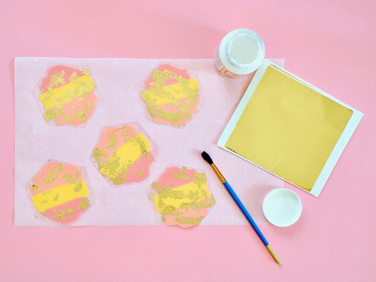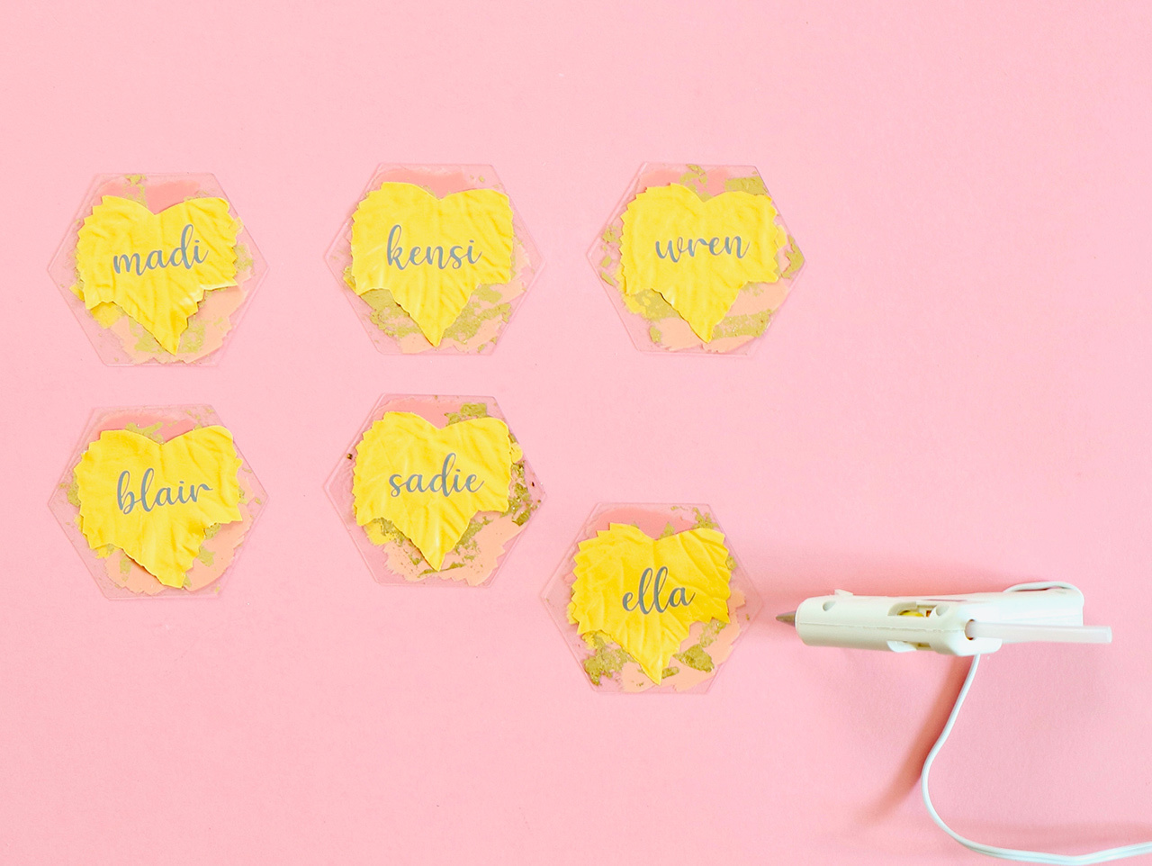 Once the paint on the hexagon place cards has dried, add a bit of glam to each by adding gold foil. To apply the foil, simply brush on a bit of Mod Podge® using a paint brush, and then lay the gold foil directly on top. Let the foil sit for several minutes to allow the Mod Podge® to dry, and then using a dry brush, gently brush off the excess foil.