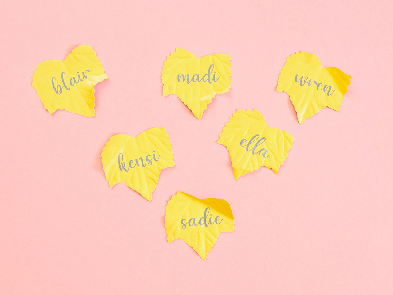 Add personalization to each of the small maple leaves by either writing each guest's name using a paint marker, or if you have a cutting machine, cut each name out of charcoal grey vinyl.