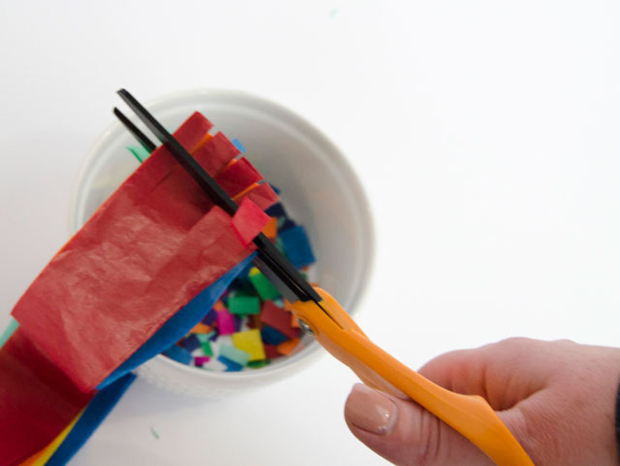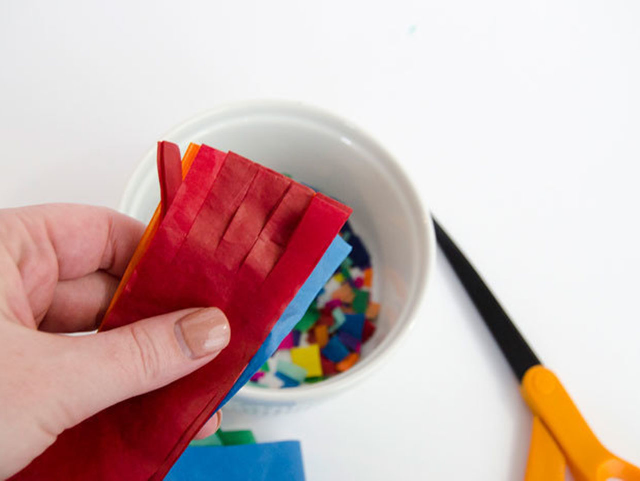 Layer multiple colors of tissue paper on top of each other. Cut into thin strips. At the end of those strips cut four or five, 1″ slits.