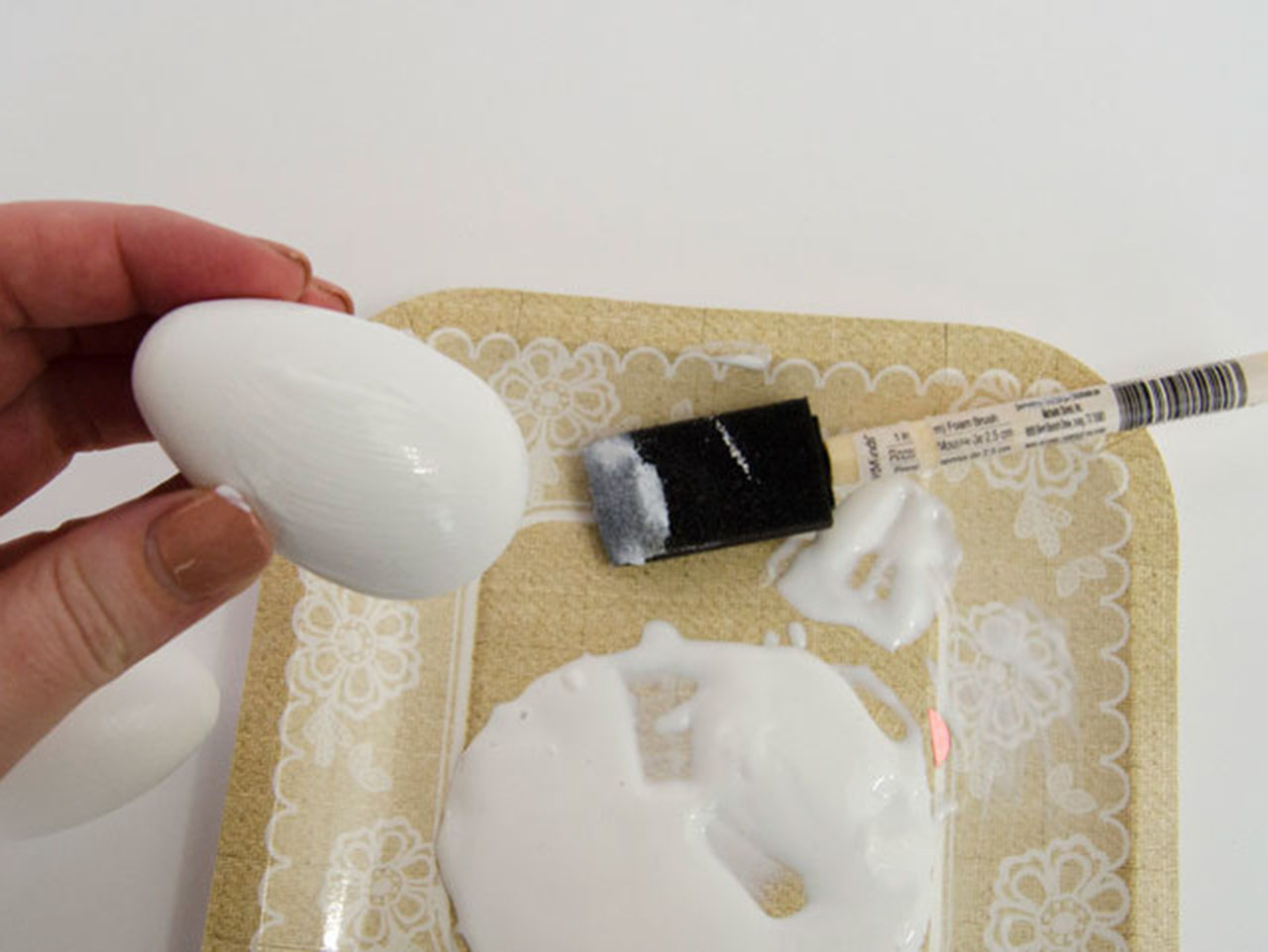 Cover the DIY Wonderful Wood Eggs with Mod Podge® using the sponge brush.