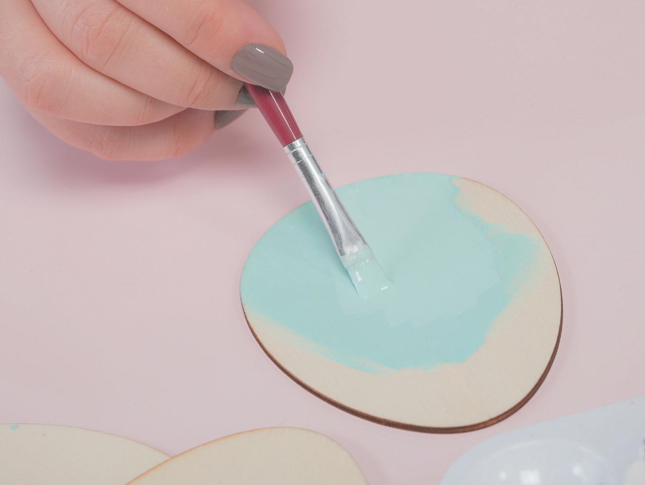 To make the Egg Garland Embroidery Hoop, paint 4 of the Flat Wood Eggs with acrylic paint and a flat bristled paint brush. Allow time for the paint to dry.