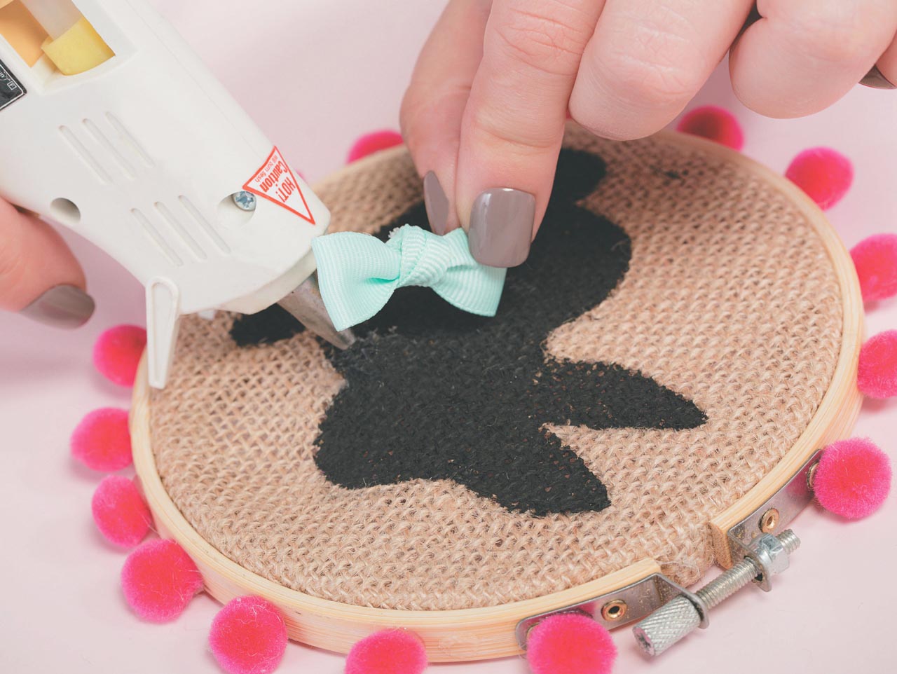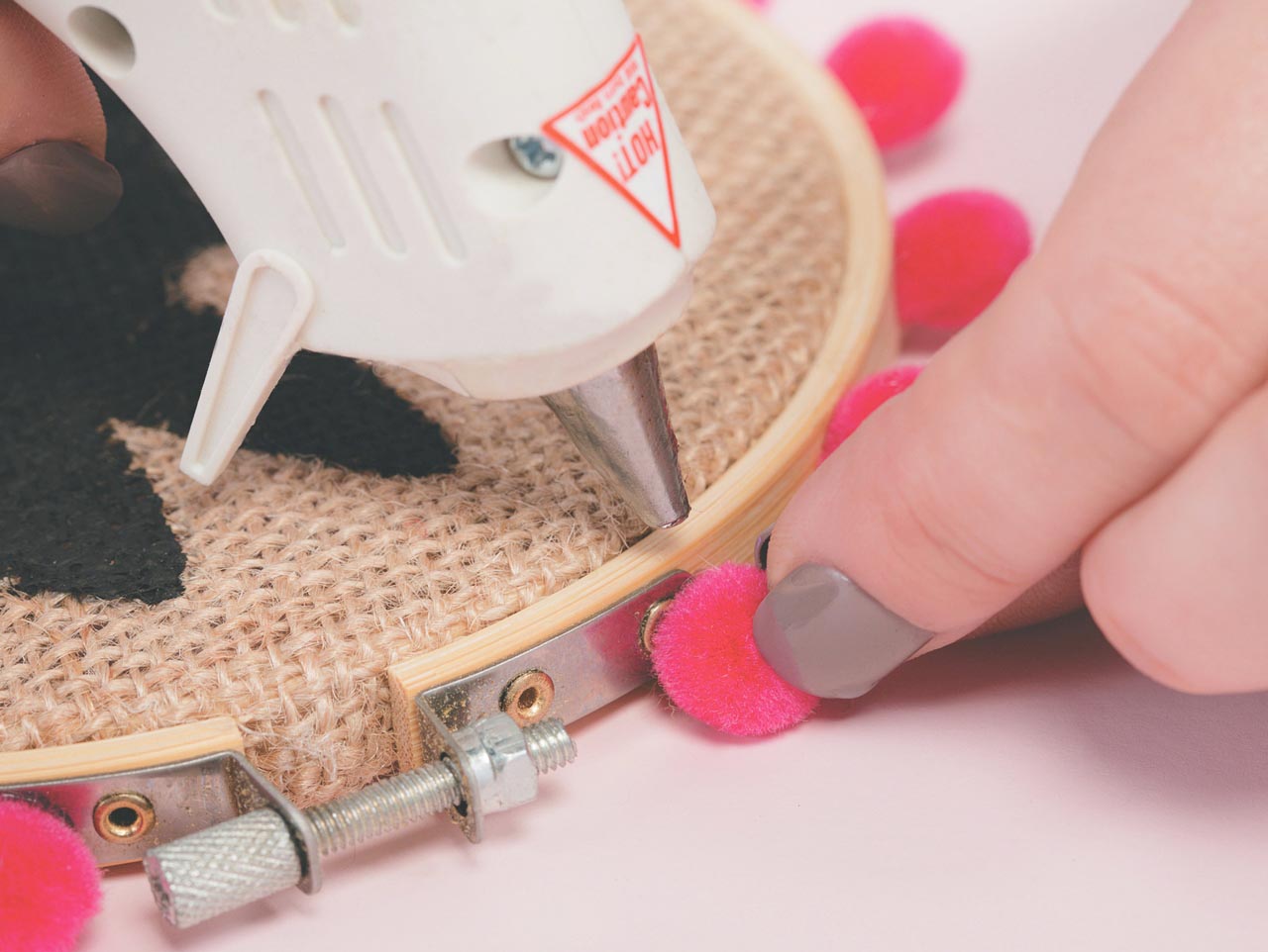 Glue pom-poms around the wooden embroidery hoop. Tie a pretty ribbon bow and glue it onto the burlap bunny.