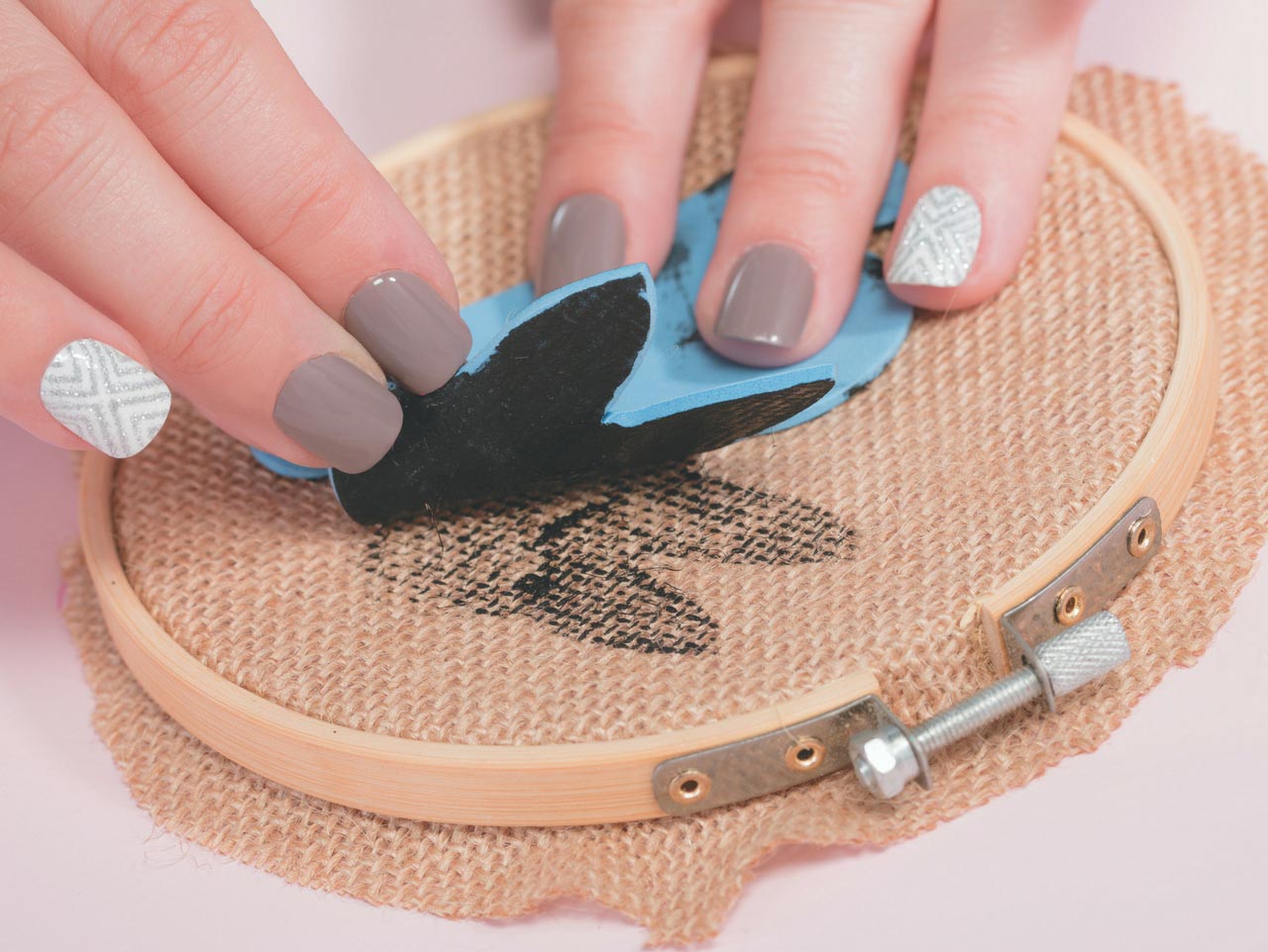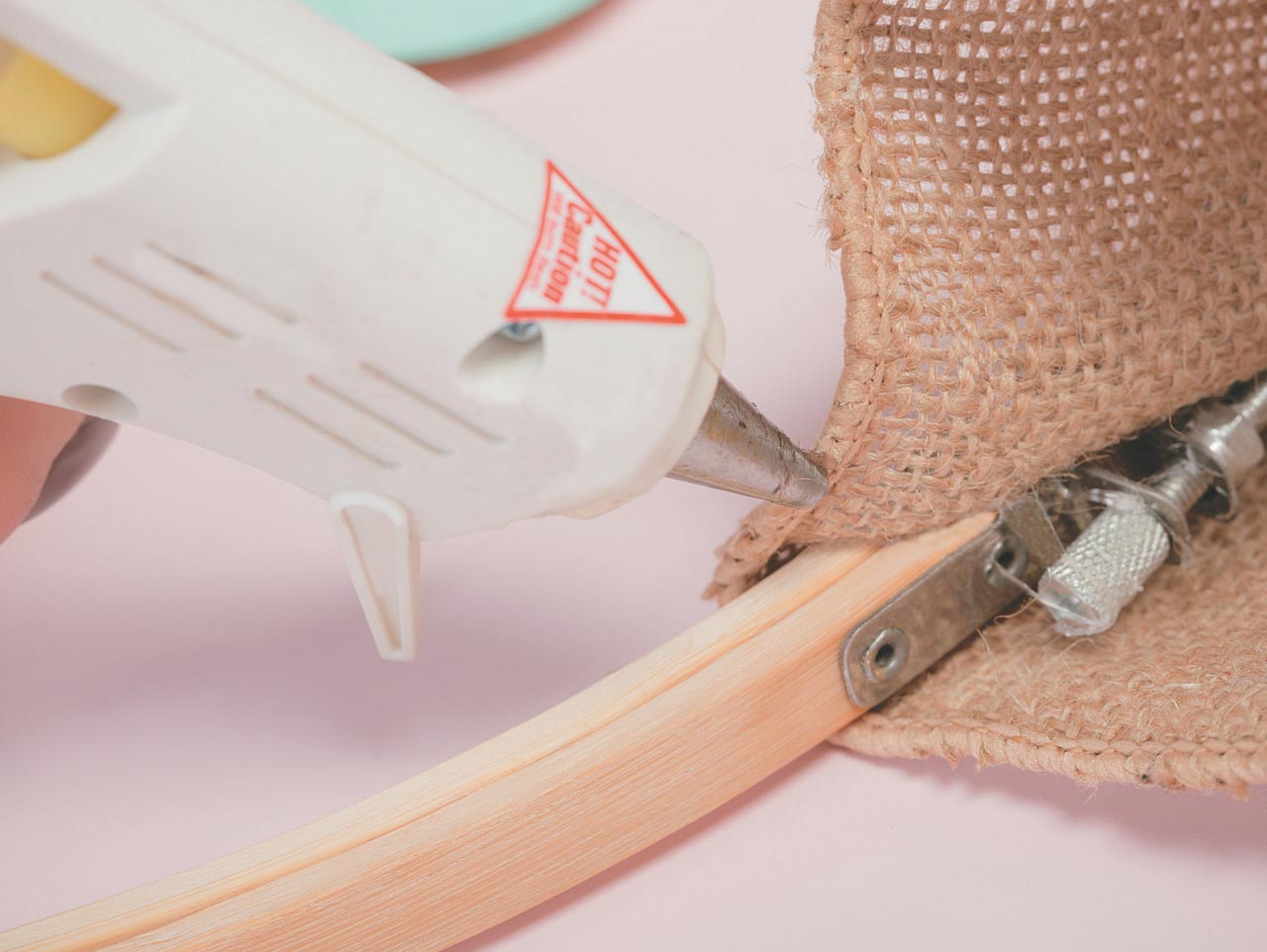 Glue a length of burlap ribbon to the top of the embroidery hoop to use as a hanger.