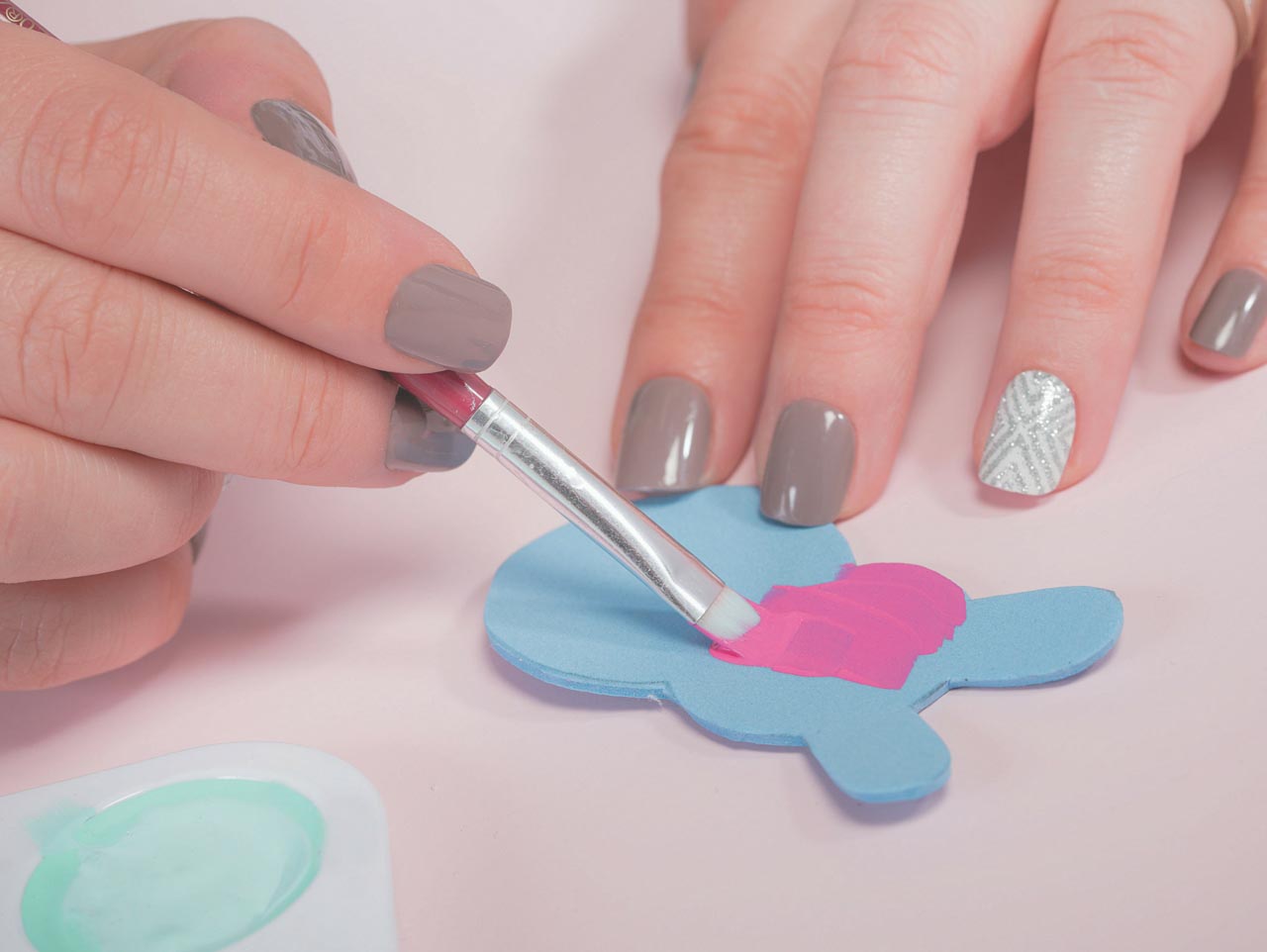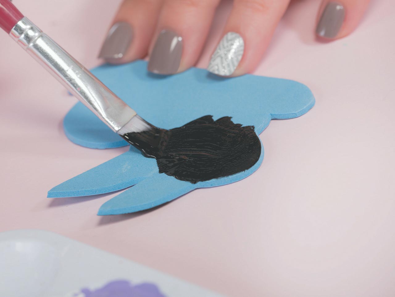 Download the Free Printable Bunny Template here then print and cut out. Trace the bunny template onto a sheet of Craft Foam and cut out. Using a flat bristled paint brush and acrylic paint, apply paint to one side of the bunny. Stamp the bunny onto the canvas and fill in any places not ‘stamped’ with paint. Once the paint is dry, use hot glue to attach a white pom-pom to each of the bunnies.