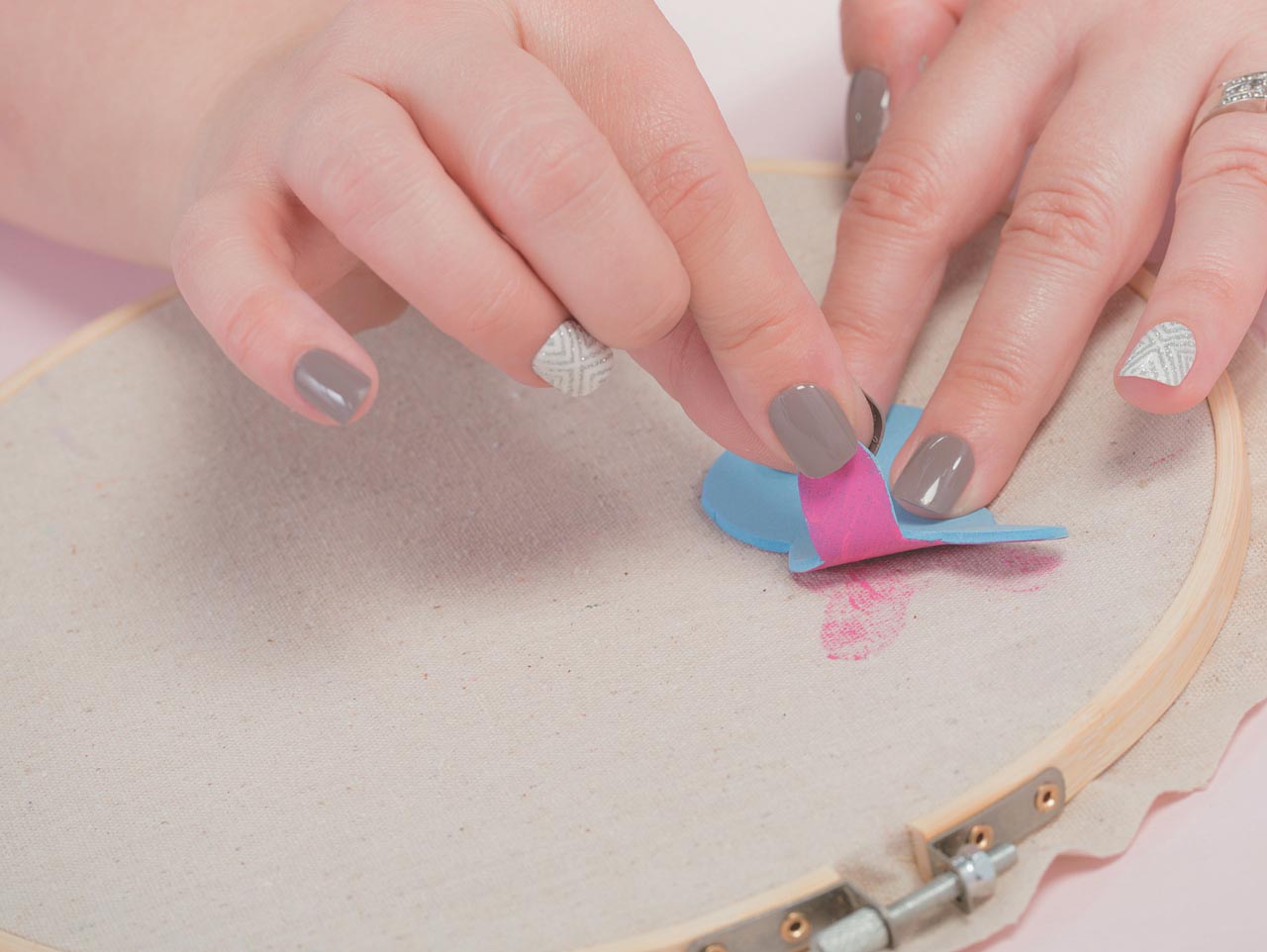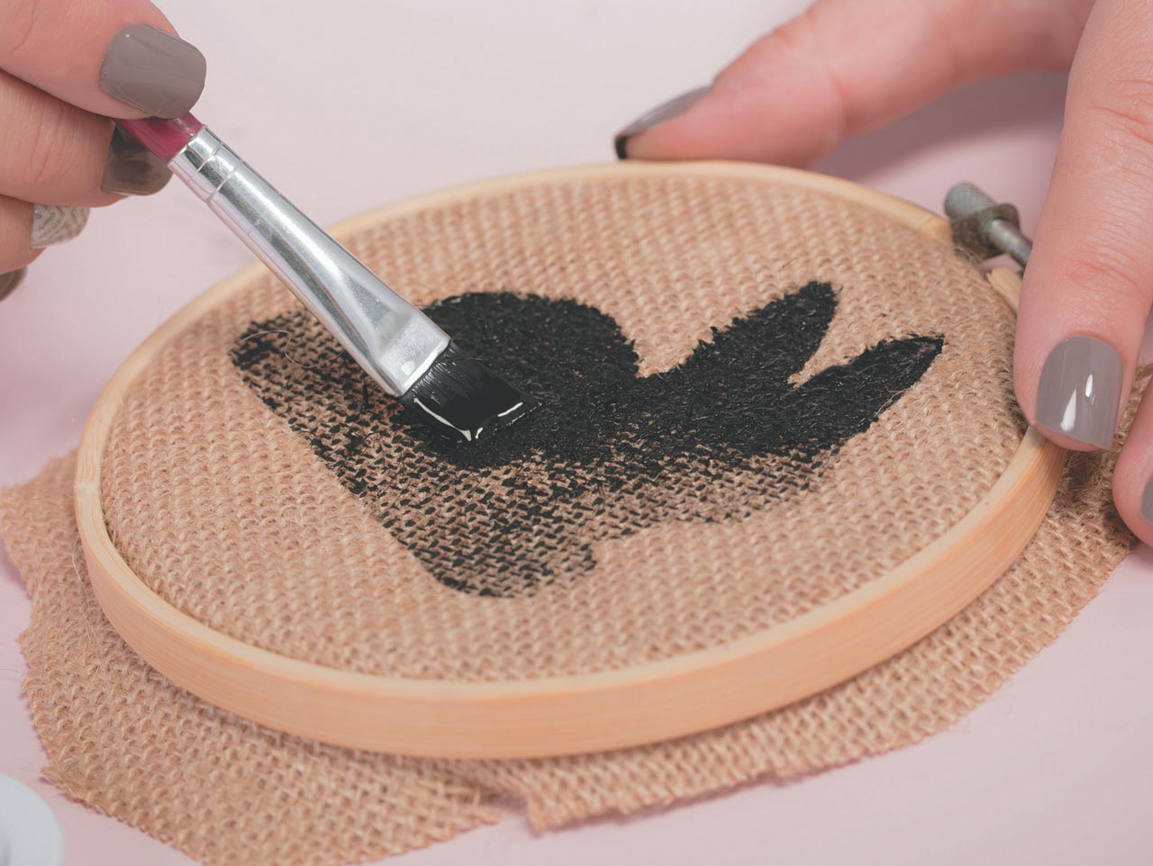 Cut the sides of a Natural Canvas Bag so that you have one large piece of fabric. Unscrew the 9” Embroidery Hoop and place the inner ring on a flat surface. Place the cut canvas bag on top of the inner ring and insert the outer ring onto the inner ring, screwing the hoop to hold in place. Cut off the excess canvas, leaving about 1” from the embroidery hoop. Use hot glue to glue the excess canvas around the back of the hoop.