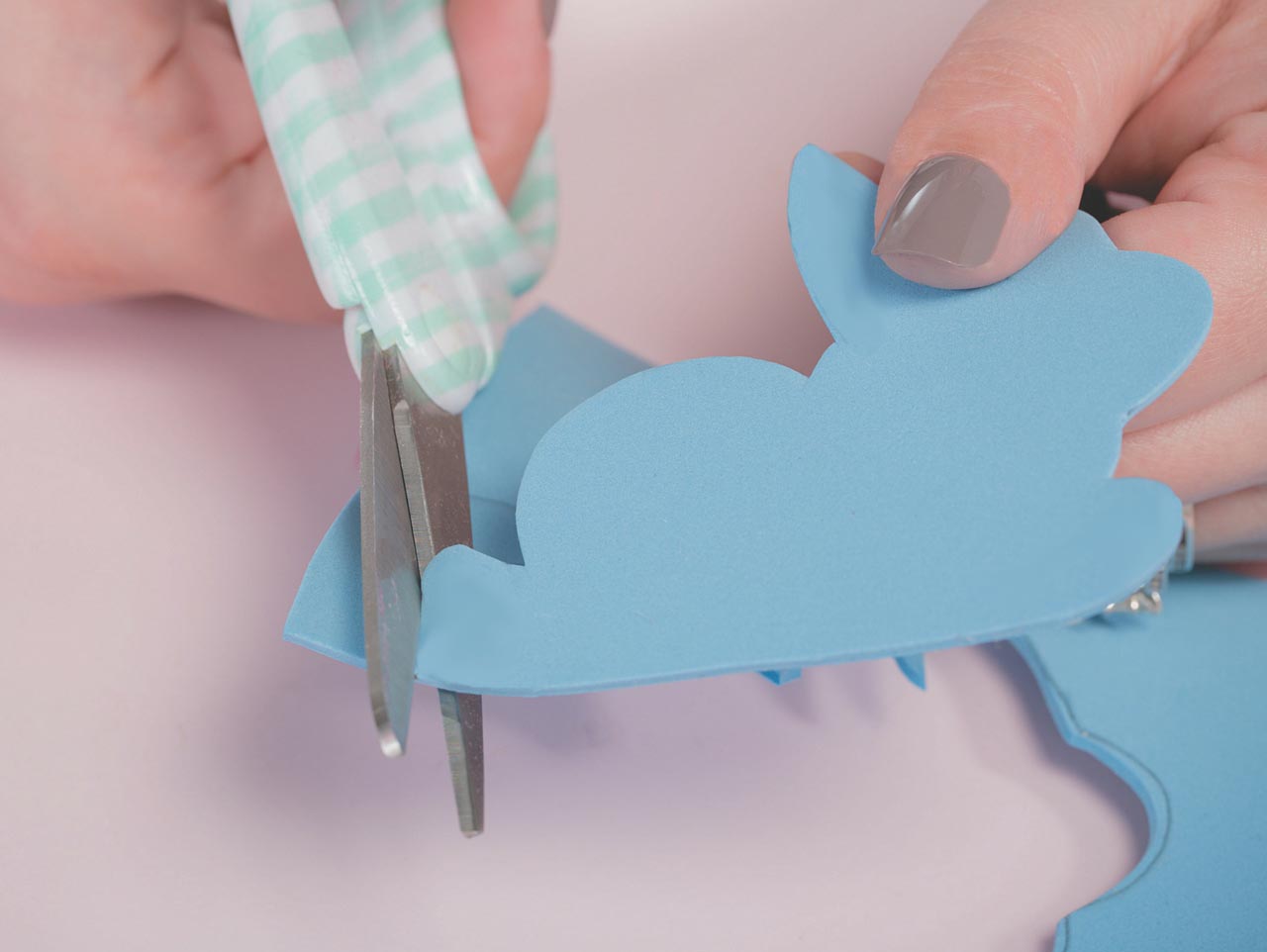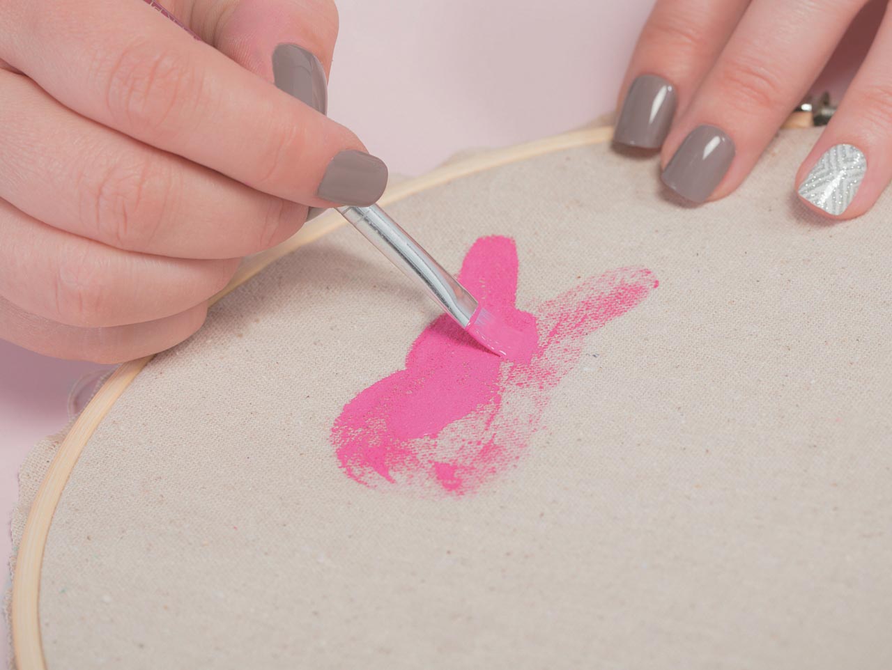 Print and cut out the paper bunny template. Trace the bunny template onto a sheet of Craft Foam and cut out. Using a flat bristled paint brush and acrylic paint, apply paint to one side of the bunny. Stamp the bunny onto the burlap and fill in any places not ‘stamped’ with paint.