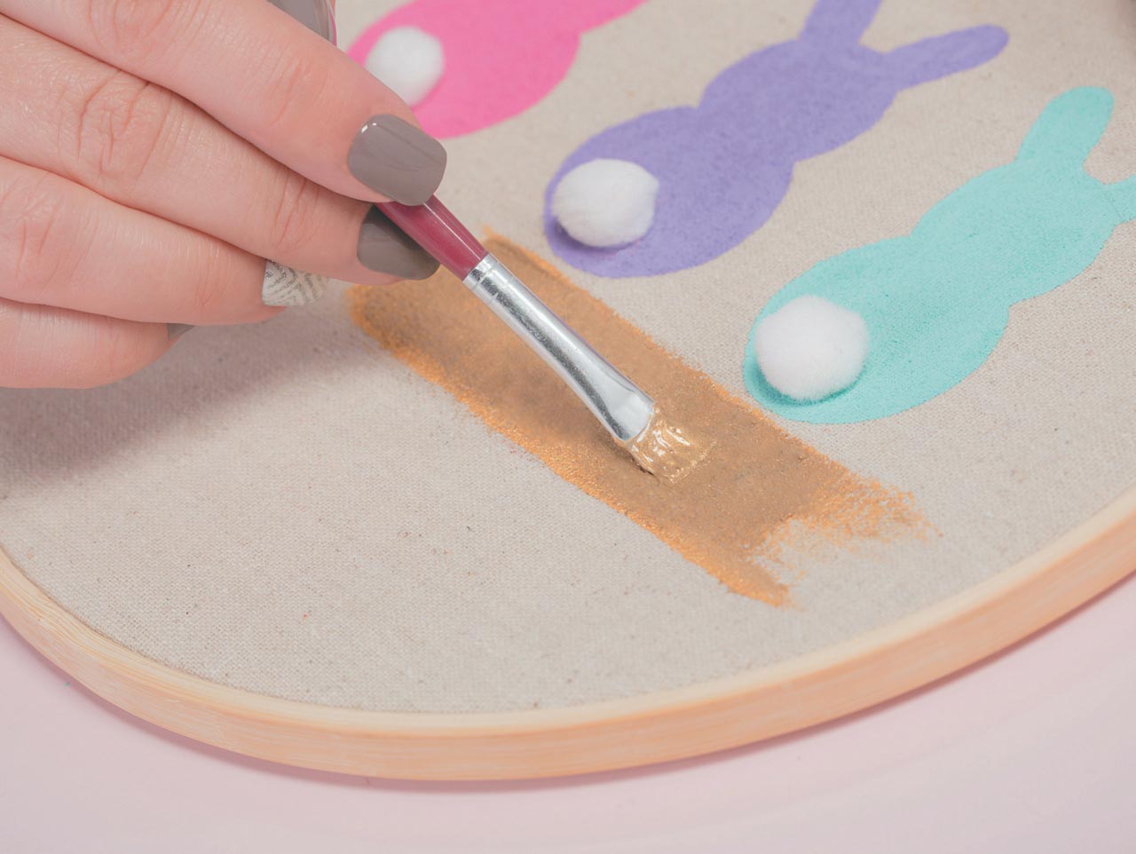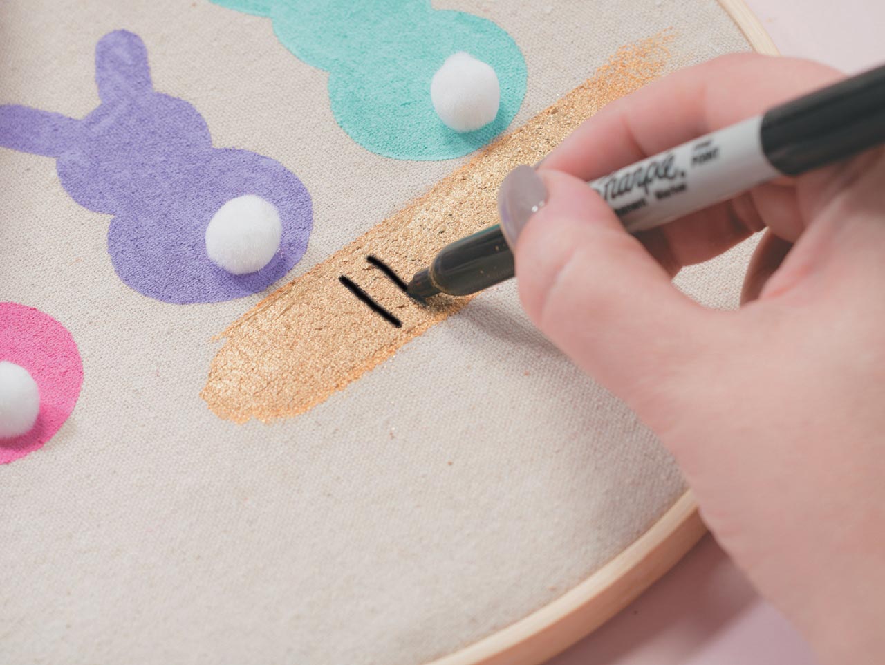 Use gold acrylic paint to make a brush stroke directly below the last bunny and allow to dry. Use a Sharpie™ to write "Hip-Hop" or any Easter message you choose on top of the dry gold brush stroke.