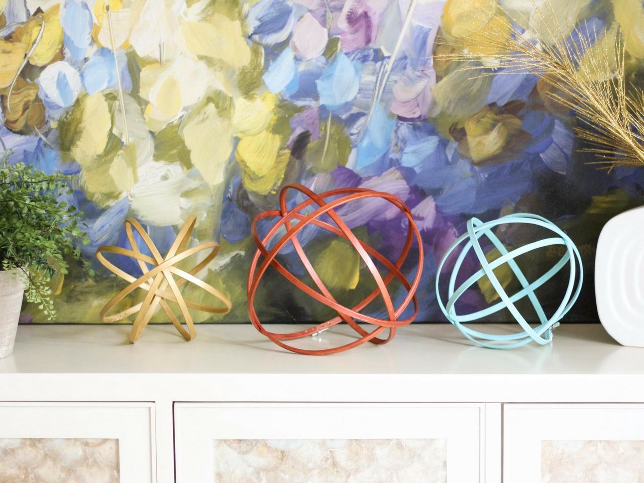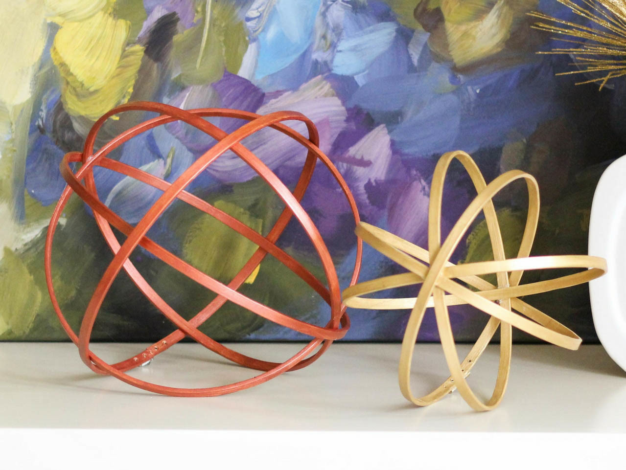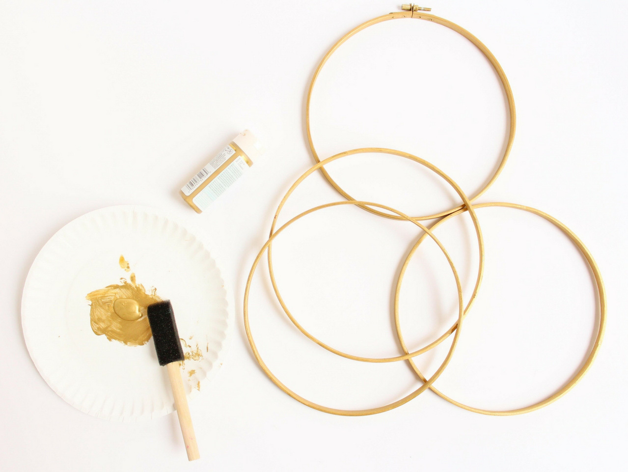 For each orb you will need two embroidery hoops (four rings total when separated). Any of the embroidery hoop sizes - large (12"), medium (9:), or small (5") - will work. I'm using the medium rings in this example. Paint each of the four rings with acrylic craft paint and a foam brush. I especially like metallic paint colors such as gold or bronze for the orbs. Let dry and add a second coat, if necessary.