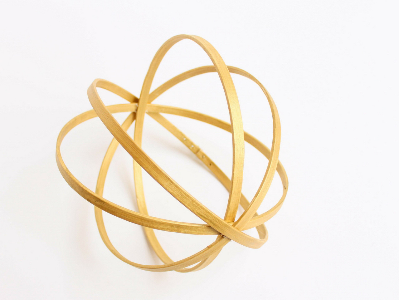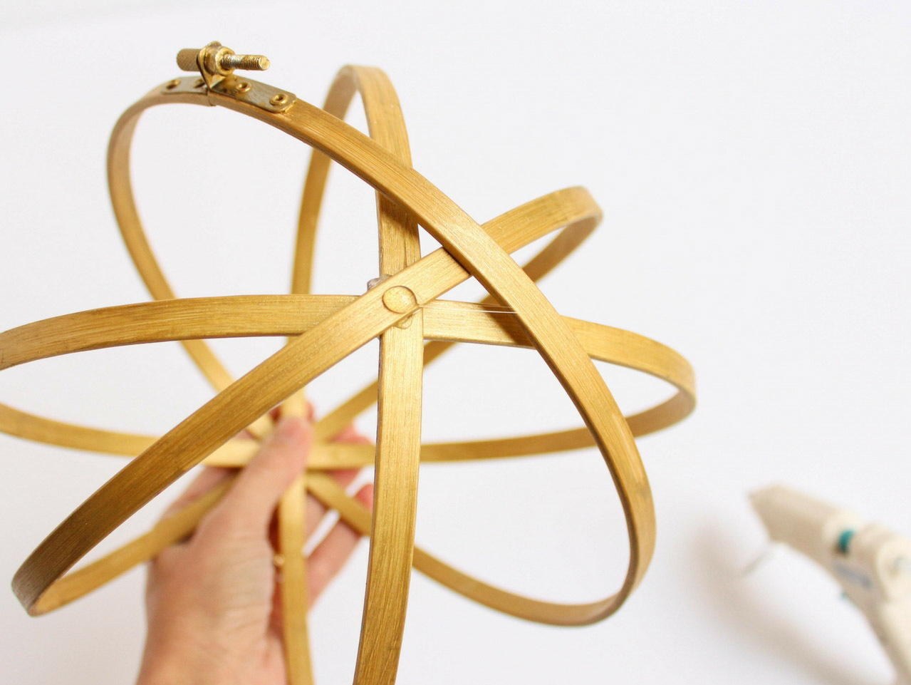 Finish your orb by adding the fourth ring perpendicular to the point where the other three rings meet. Secure in place with a small dab of hot glue.