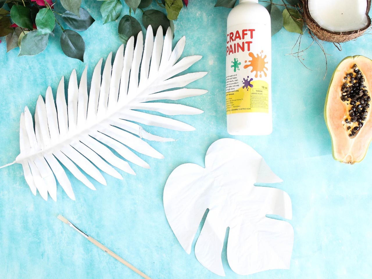 Add a coat of White Acrylic Paint to three Tropical Leaves and three Palm Leaves. Allow to dry.