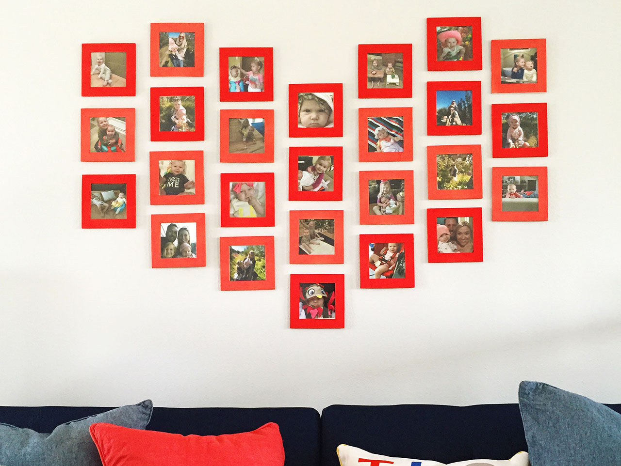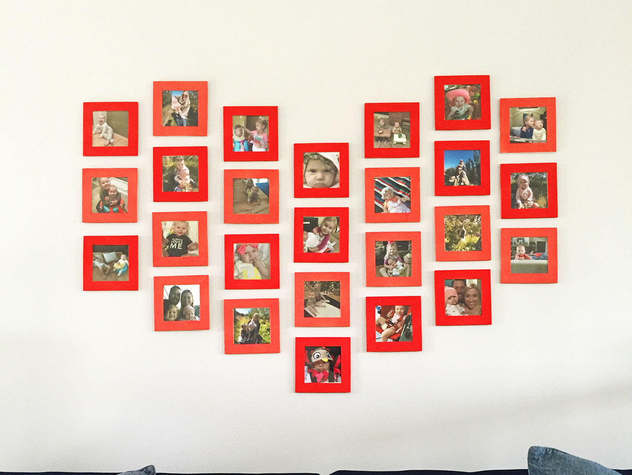 Start from the center row and work your way out spacing nails 7″ apart vertically and 4″ apart horizontally. This will create a fairly tight heart shape (with 2 inches between frames) when complete.