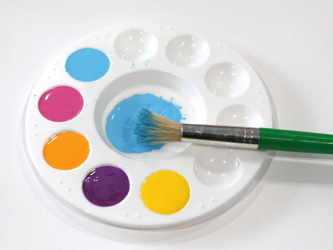 Using the tropical acrylic paint set, squeeze orange, yellow, pink, blue and purple paint onto a paint palette.