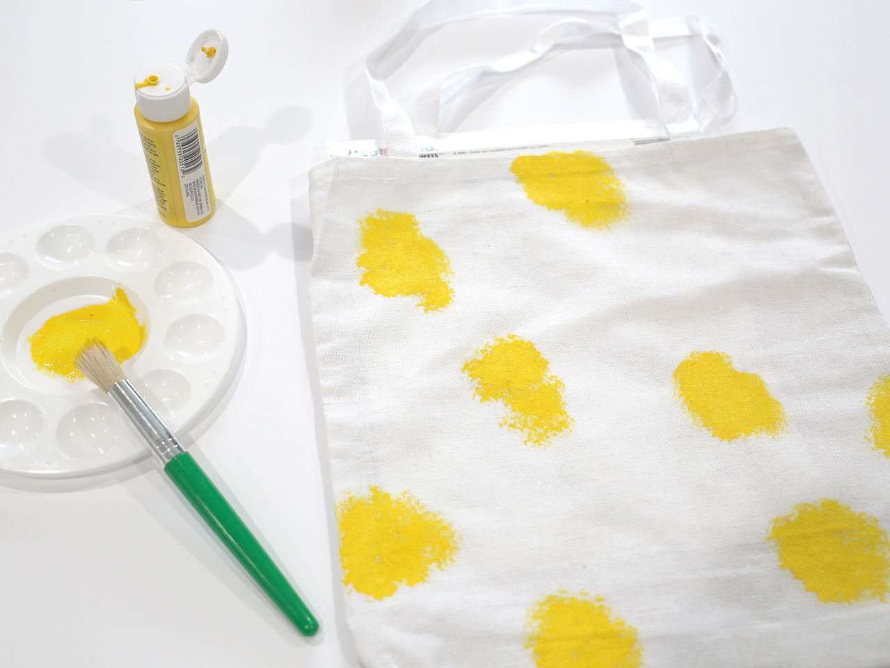 Dip the tip of a chubby paint brush into yellow paint and with an up and down motion, dab the paint onto the tote bag in varying rough shapes.