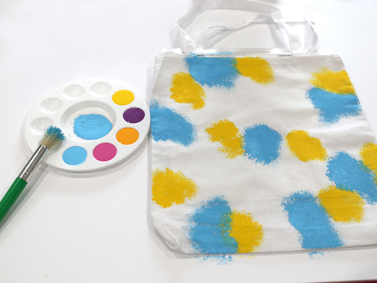 Using the same up and down technique, dab the blue paint on to the bag in varying rough shapes. Overlap the blue paint a little bit with the yellow paint.