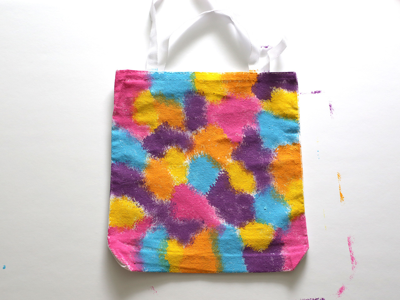 Continue this same technique with the pink, purple and orange paint until the entire tote bag is covered. Let the bag fully dry.