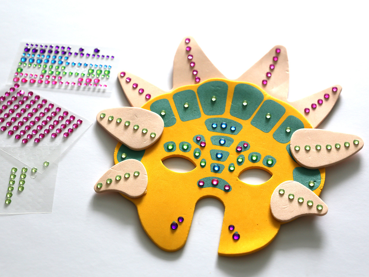 Cut the stretchy cording from a foam dinosaur mask and then embellish the mask with lots of colorful self-adhesive rhinestone jewels.