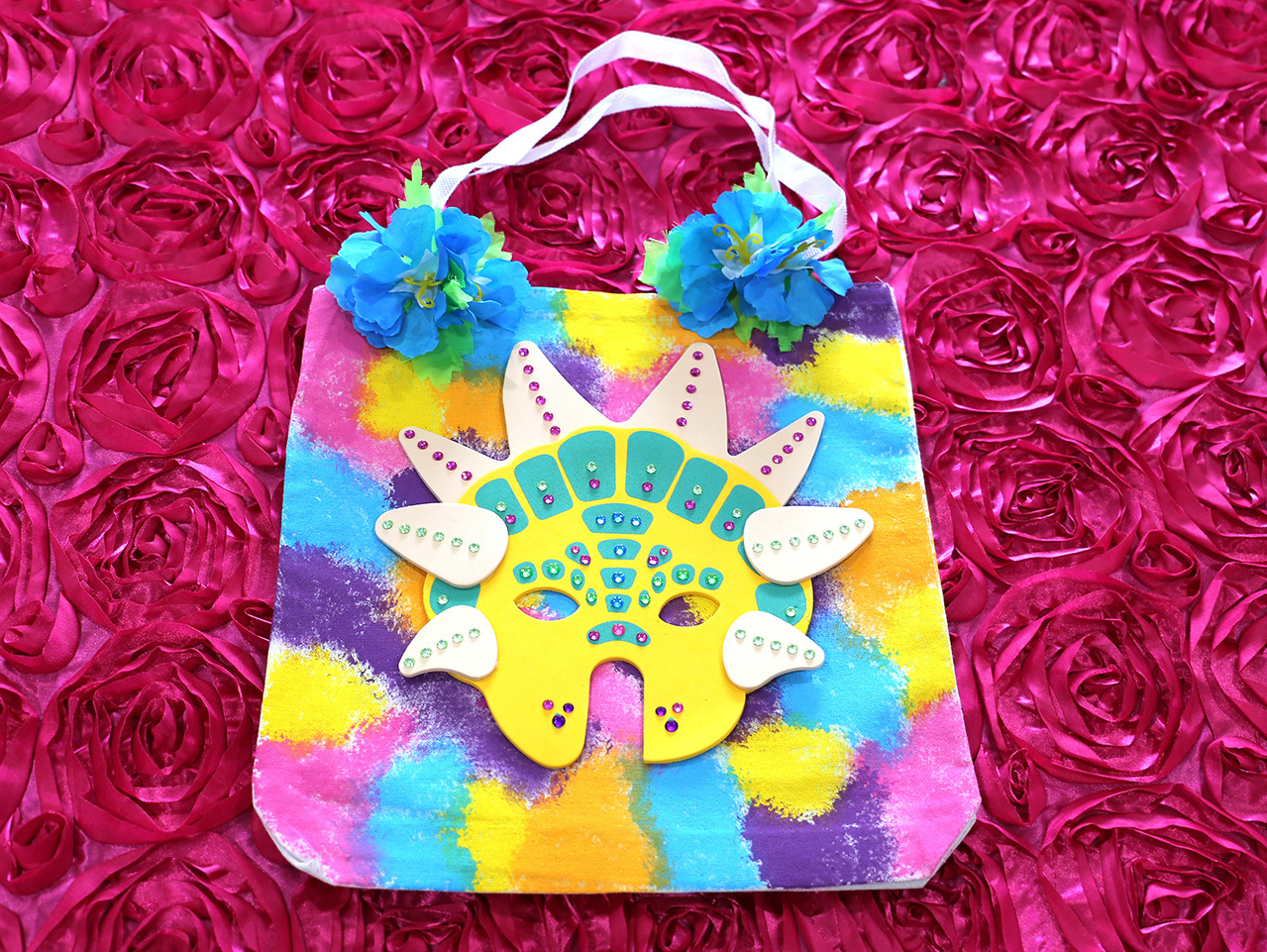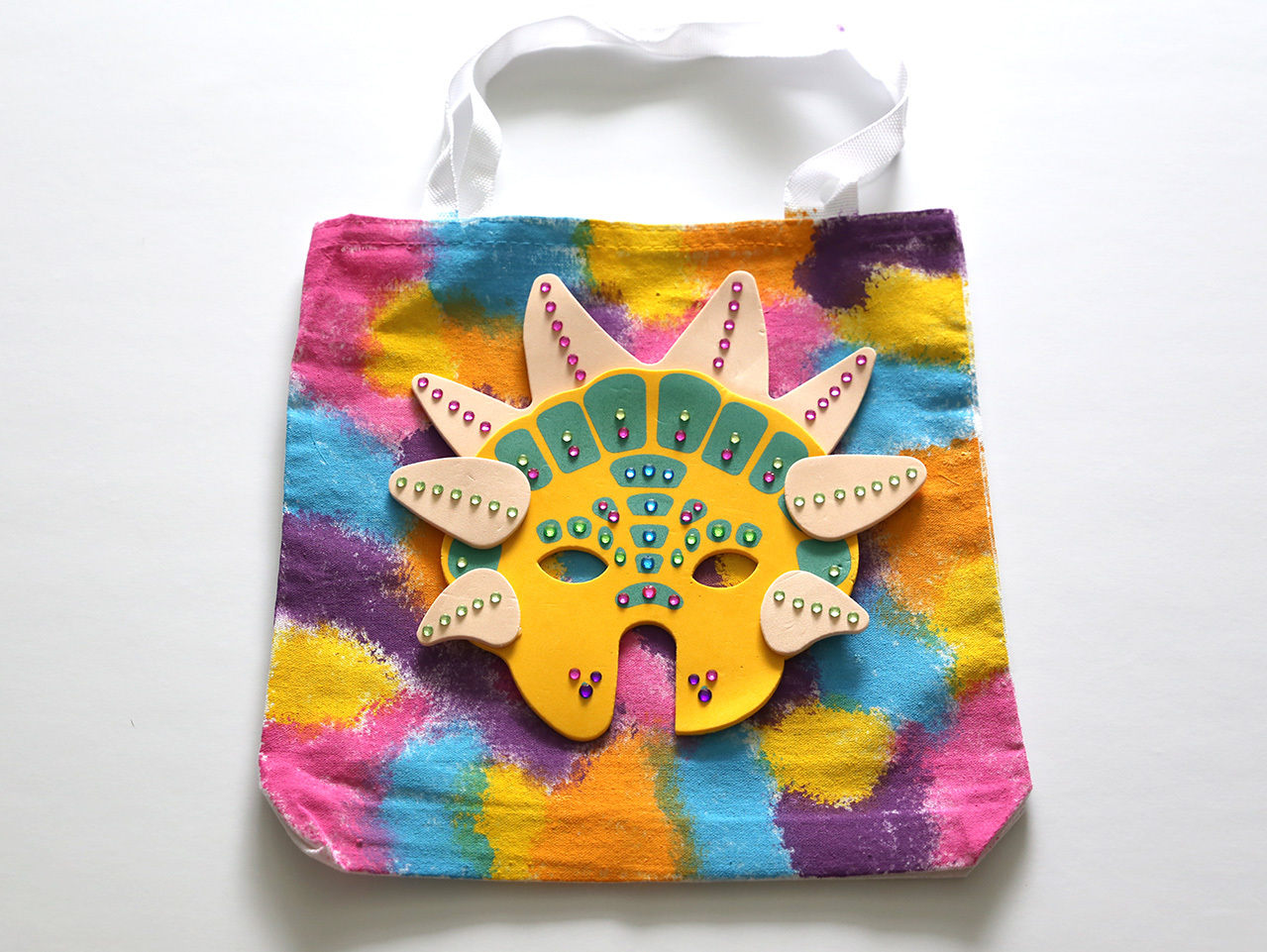 Using hot glue, attach the sparkly foam mask to the front center of the painted tote bag.