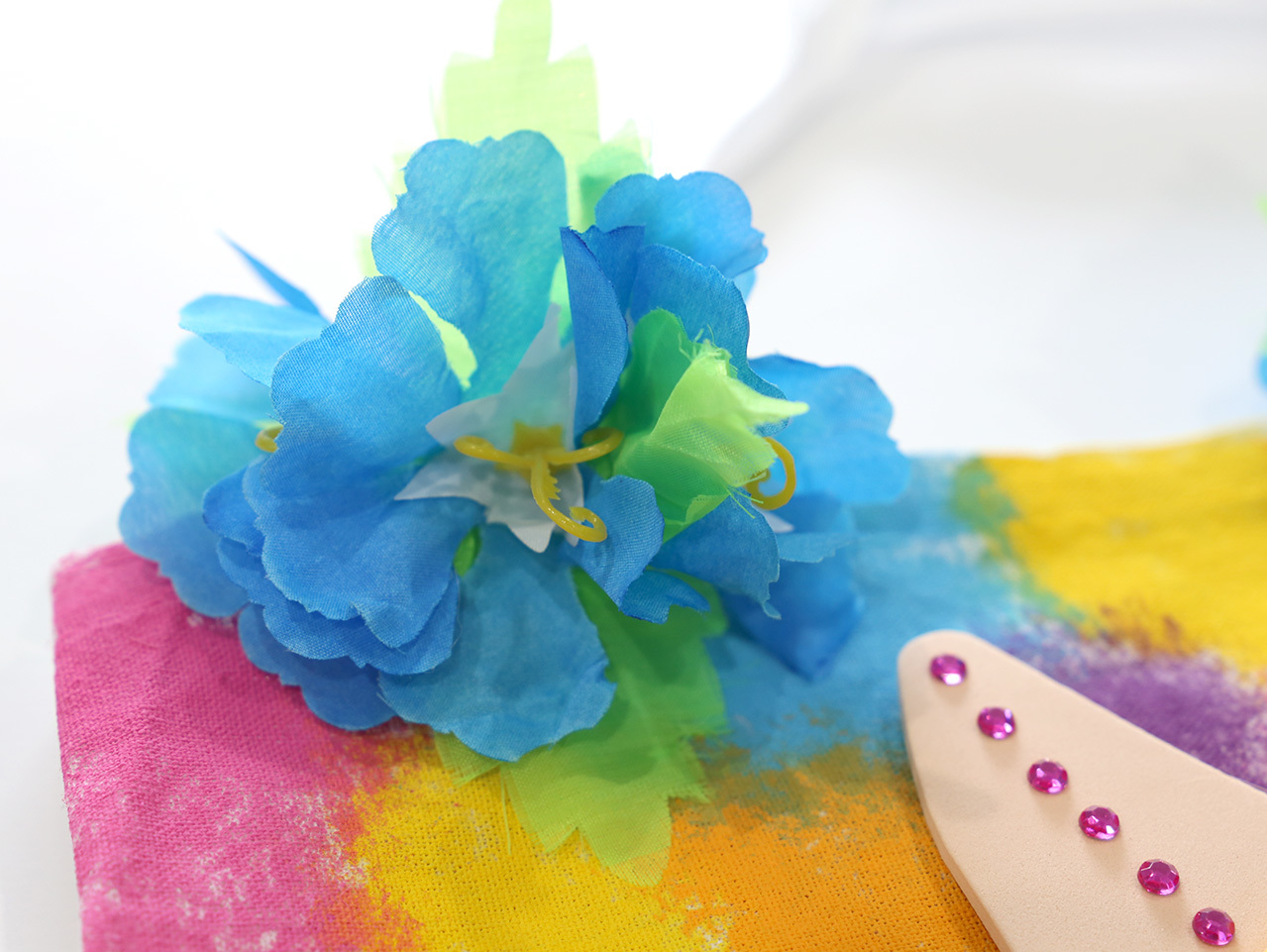 Clip two hibiscus hair clips to each handle of the tote bag where it meets the bag.