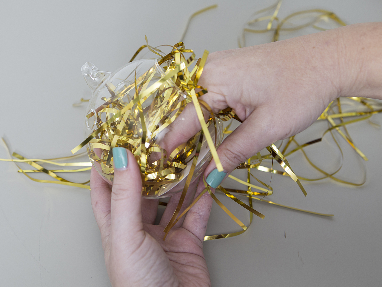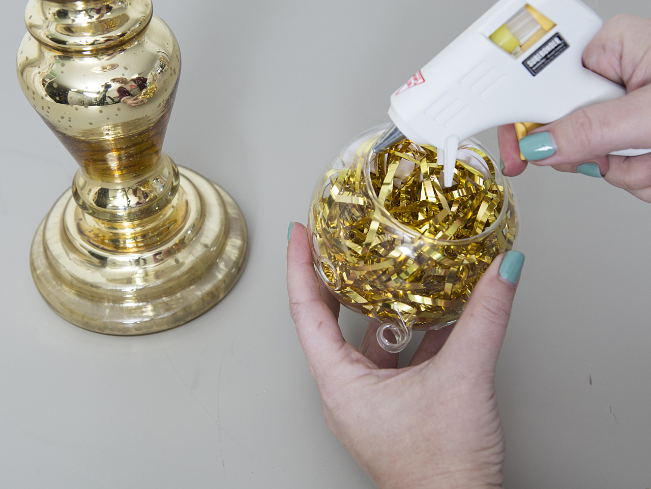 Fill the glass globes with gift crinkle shred, or any other colorful item that you'd like. I used gold metallic shred to match the gold metallic candle stands.