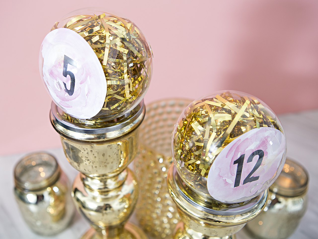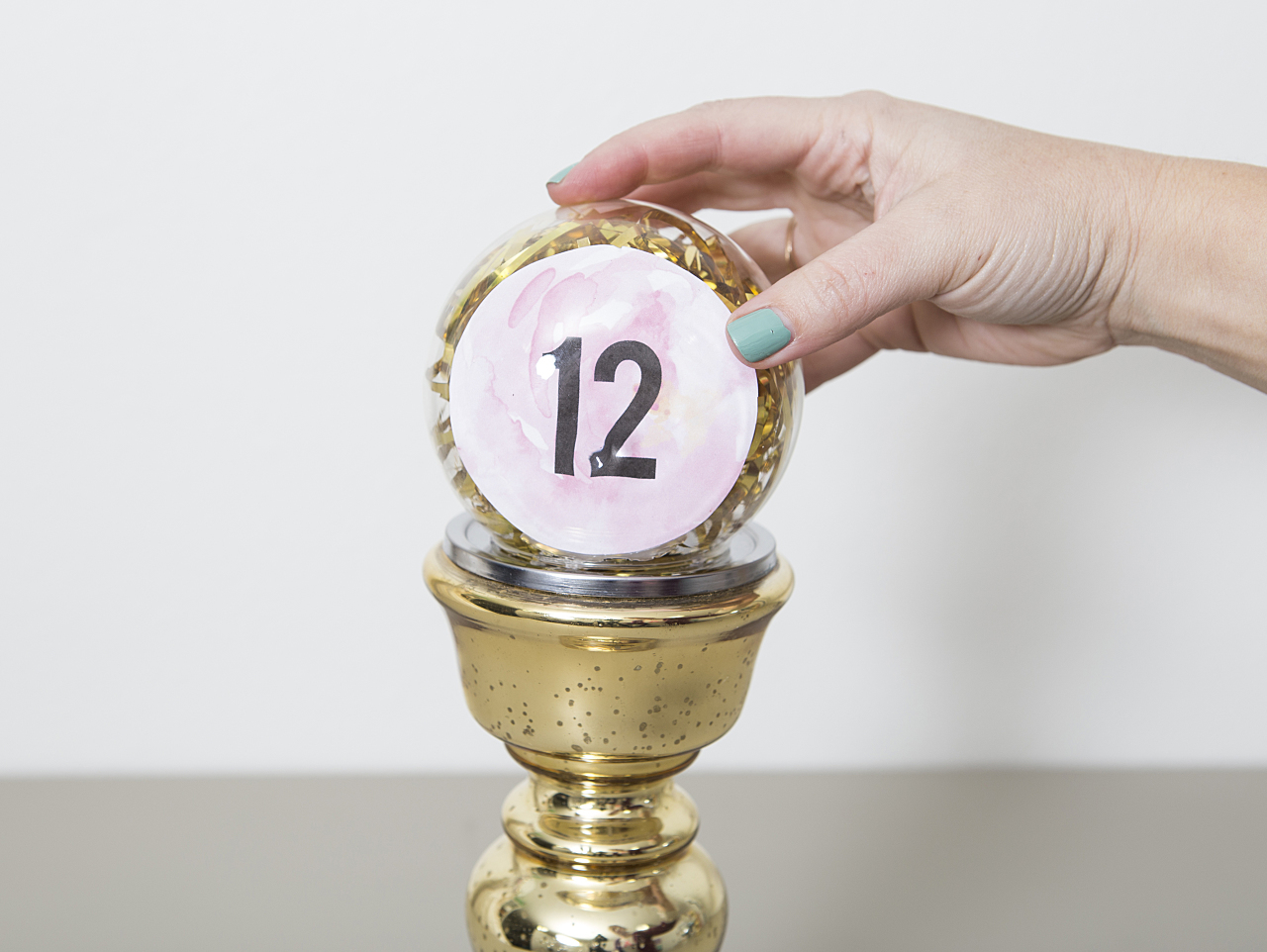 Get your table number situated how you want and then add a small line of hot glue along the edge of the table number, touching the globe to hold it in place.