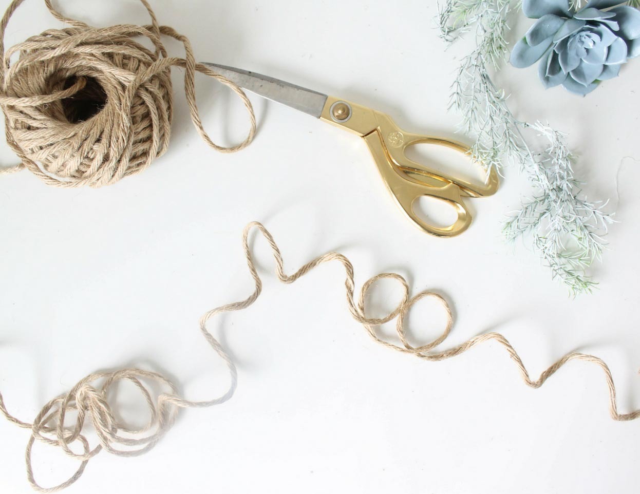 Cut a 3" piece of Soft Flex Wire and then hold the stem of your first piece of greenery against the Natural Jute and wrap the Wire around the stem and Jute to attach. We started with the Faux Pine Greenery because it is the longest and covers the most amount of space.