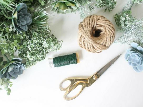 Continue this process incorporating Frosted Greenery Stems, Faux Eucalyptus Stems, Faux Mountain Grass Sprays and the painted Faux Succulent Picks until the table length of your Jute is completely covered.