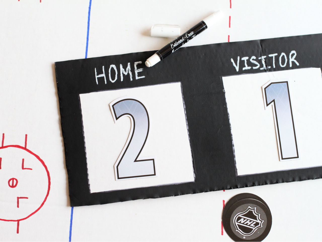 Create a scoreboard and use a chalk marker to write HOME and VISITORS. Then, use numbers from the NHL Ice Time Birthday Banner set to create the score.