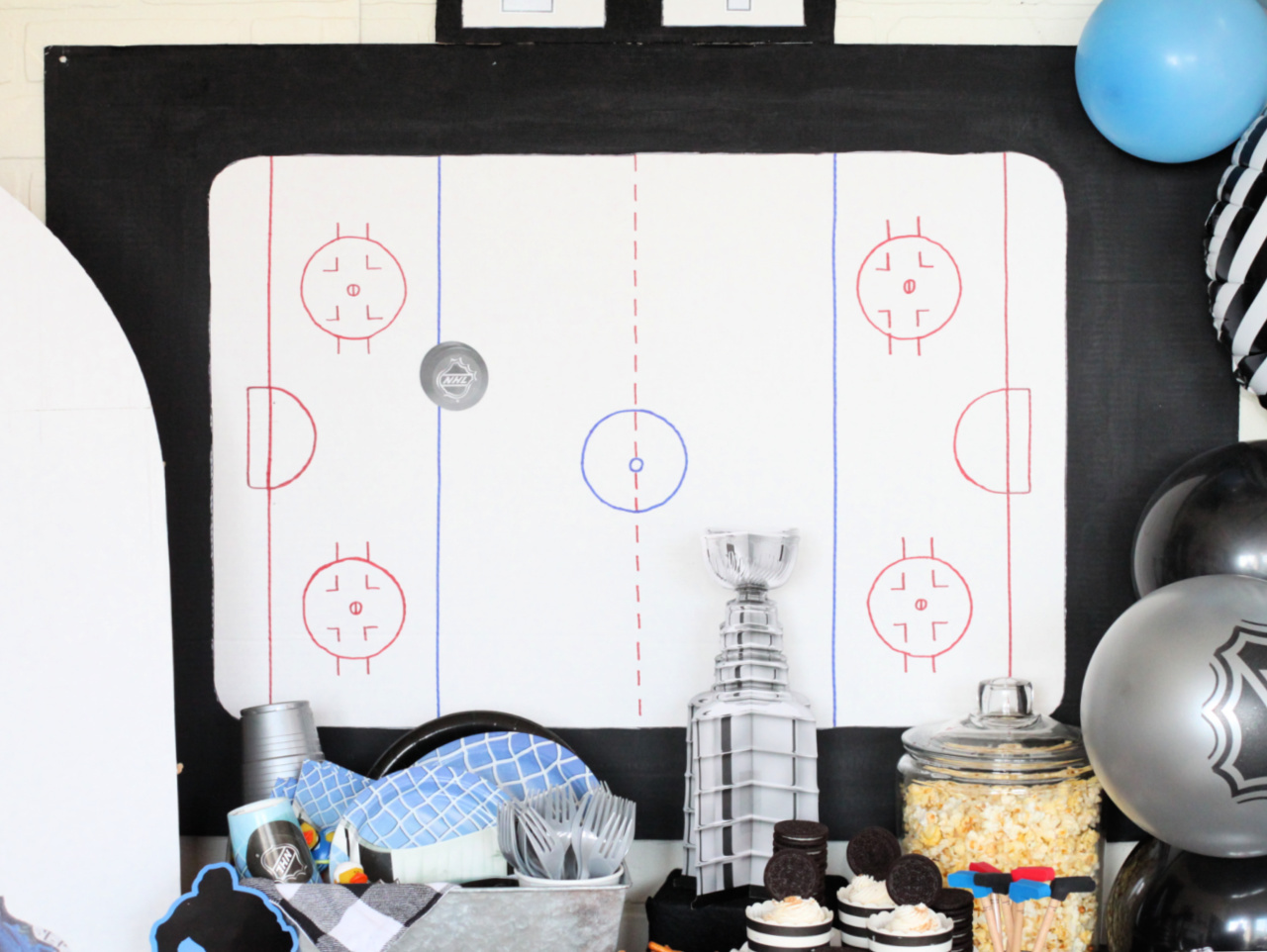 Hang the DIY hockey rink backdrop above your dessert table for a fun and easy way to add detail to your Hockey Themed Birthday Party!