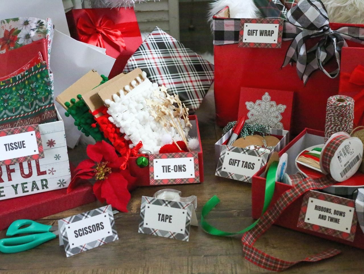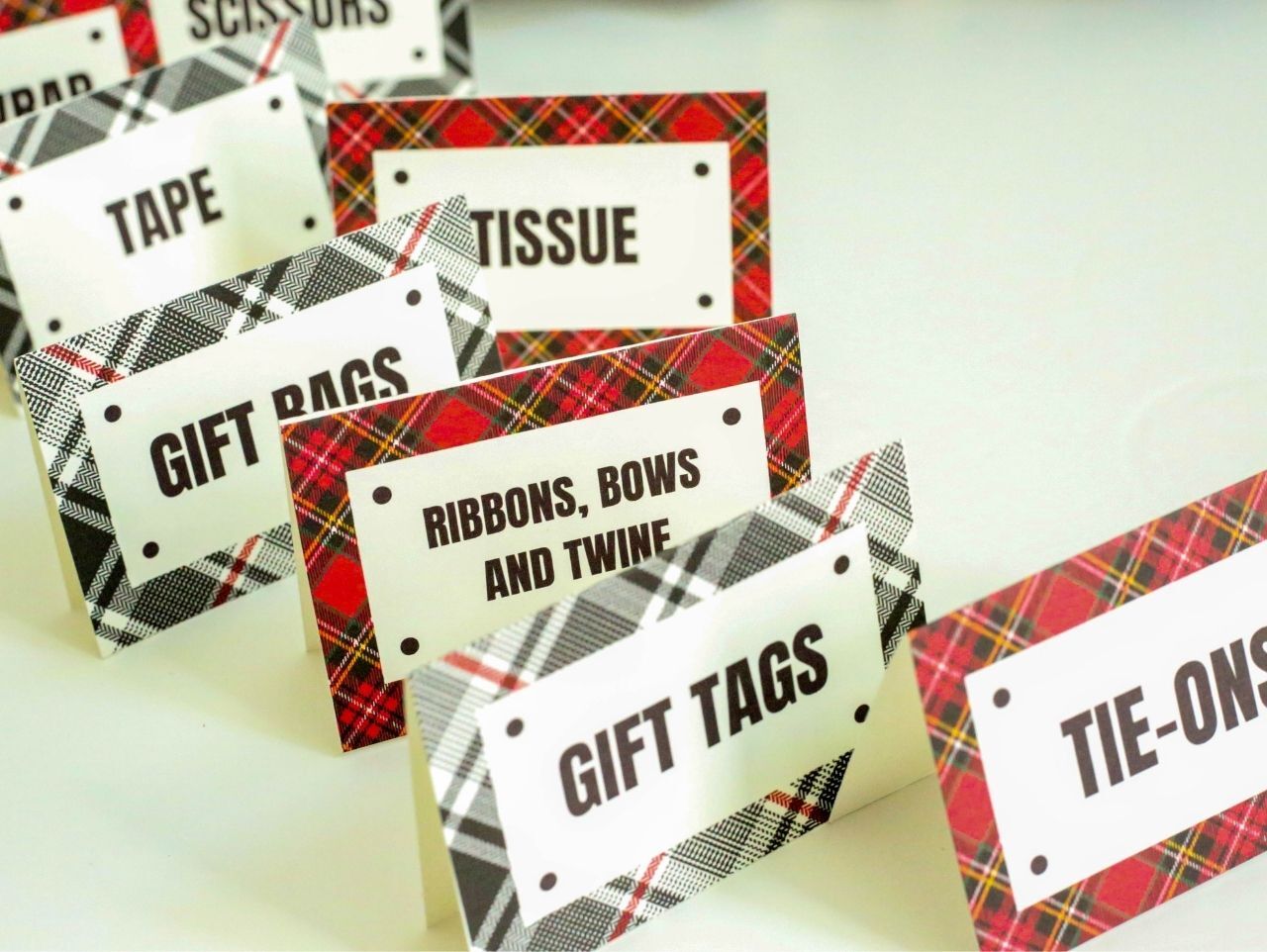 Print a set of wrapping station labels on white cardstock. These can be folded to stand up as table tents, or reduced with a paper trimmer to be a flat label.