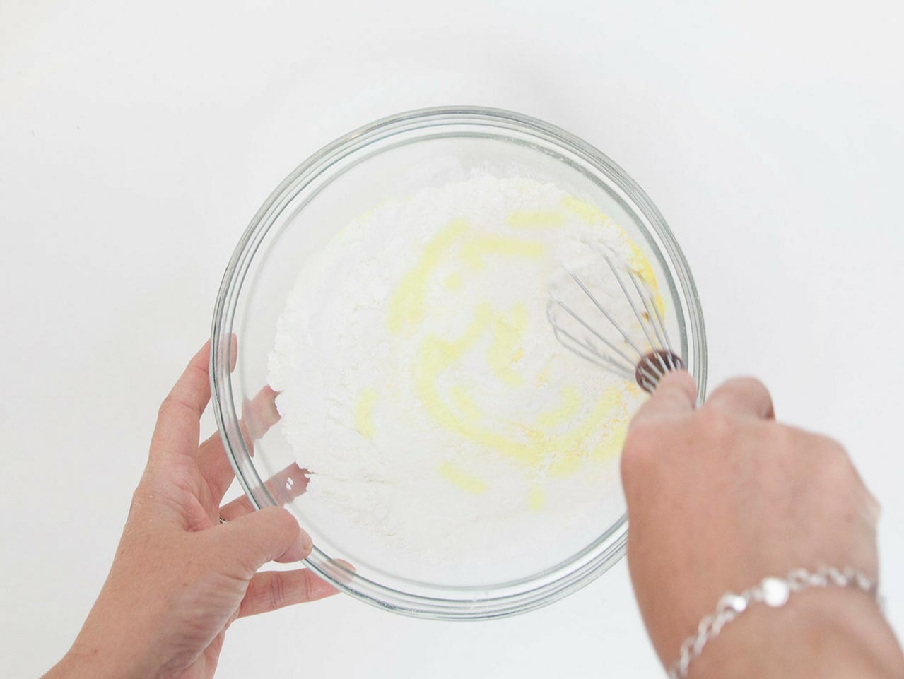 Very slowly pour the wet ingredients into the dry mix. If you see fizz, you are pouring too quickly - slow down. Continue kneading the mixture with your hands or mixing with the whisk as you blend.