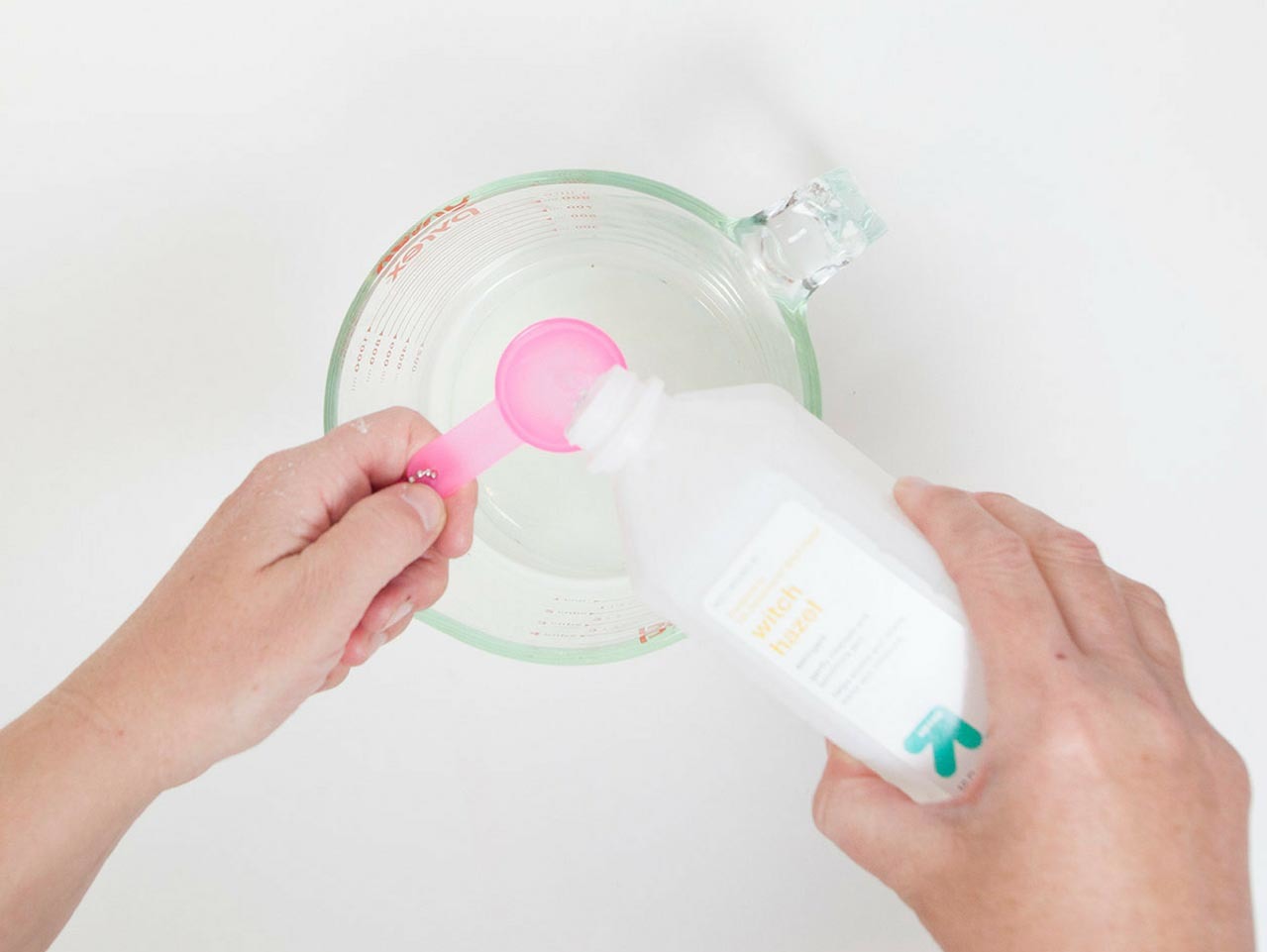 Combine all the wet ingredients into a bowl - 3 tsp of Witch Hazel, 1 tsp (or more to preference) of Essential Oil and 3 Tbs. of Vegetable Oil.