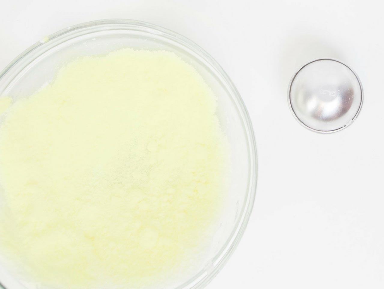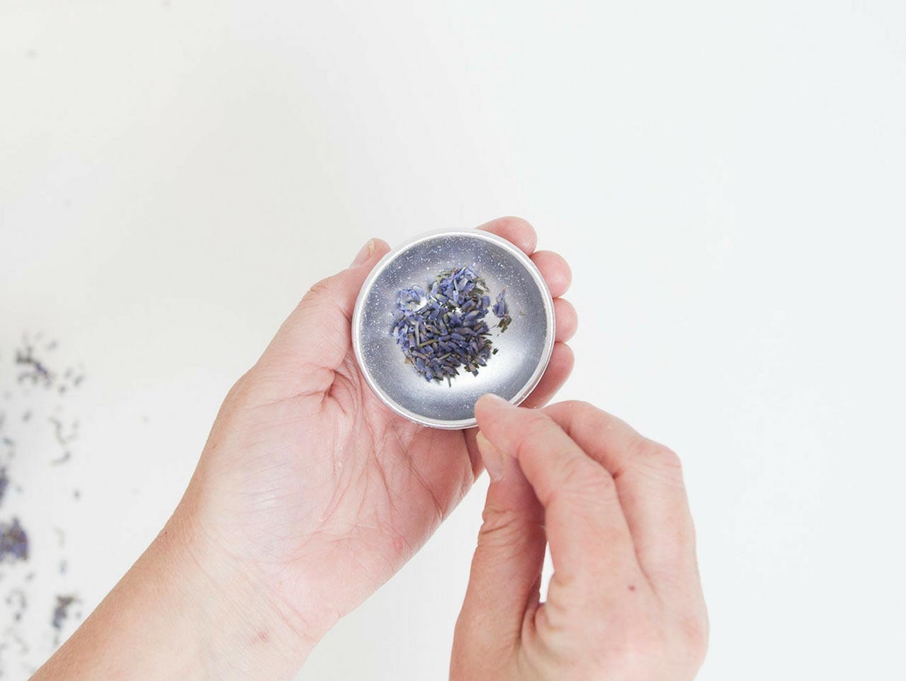 Add a sprinkle of dry lavender into the bottom of the 2nd half of mold. Then add more of the bath bomb mix to pack this side of the sphere mold.