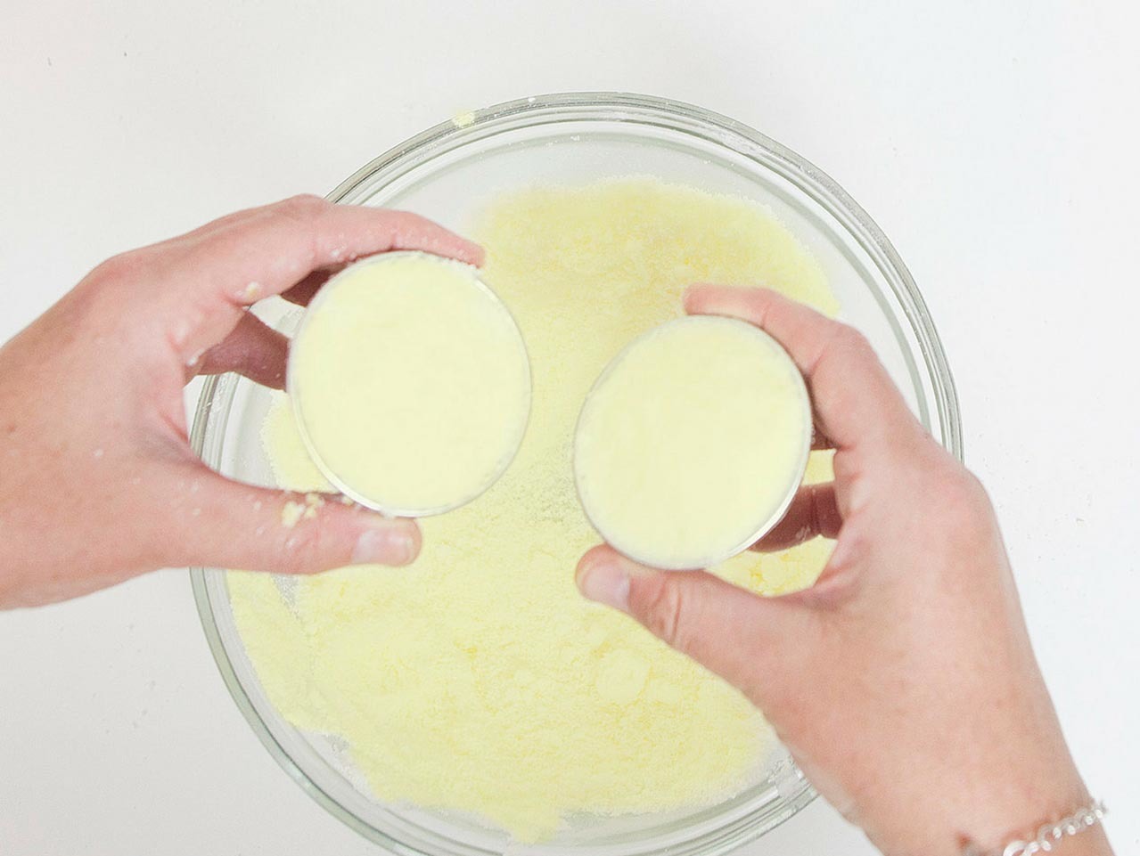 You should finish when you have a mixture that is the consistency of slightly damp sand, it should clump together when you squish the mixture with your hands. Press the mixture into one half of the sphere mold.