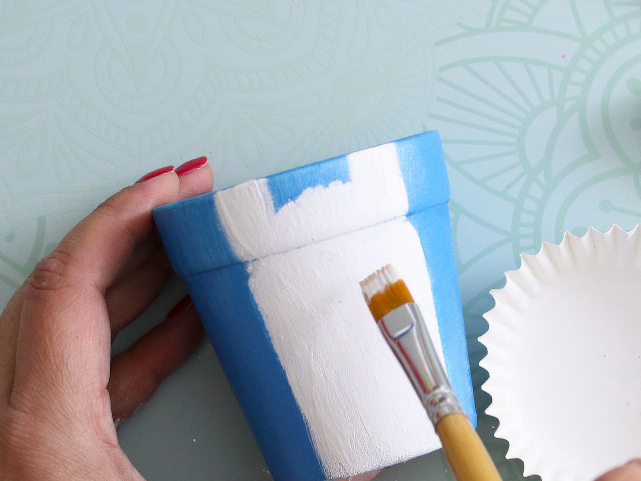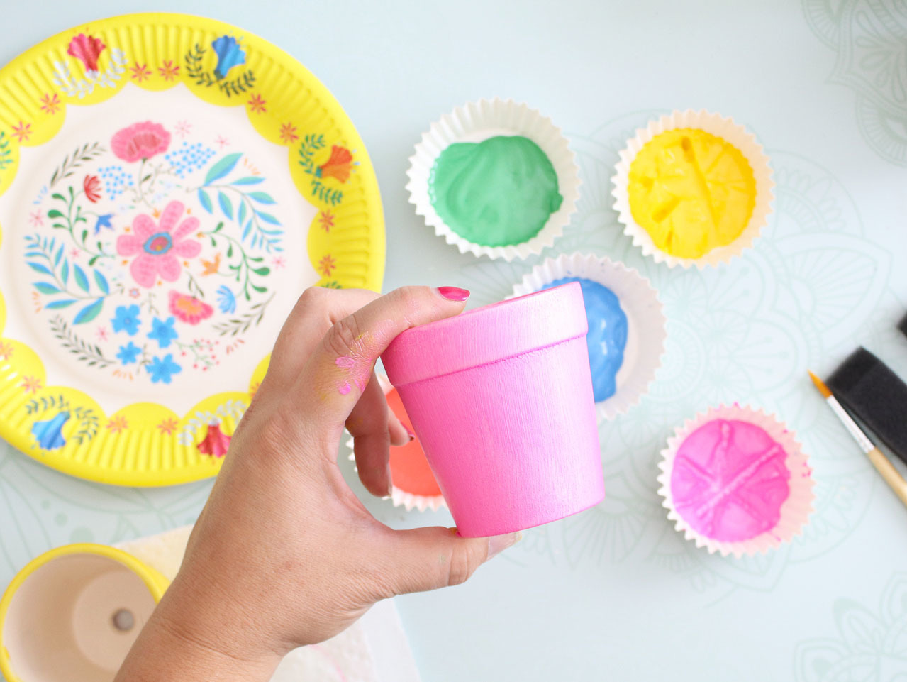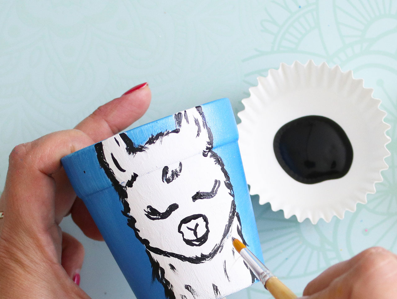Start by mixing paint colors to match the Llama Boho Paper Dinner Plates. Apply 1-2 coats of paint to the DIY Ceramic Mini Flowerpots.