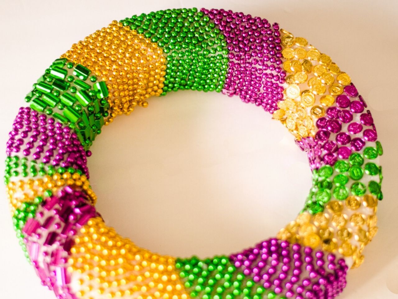 This is what the finished wreath should look like once you're done wrapping all of the Mardi Gras Beads around the White Foam Wreath.