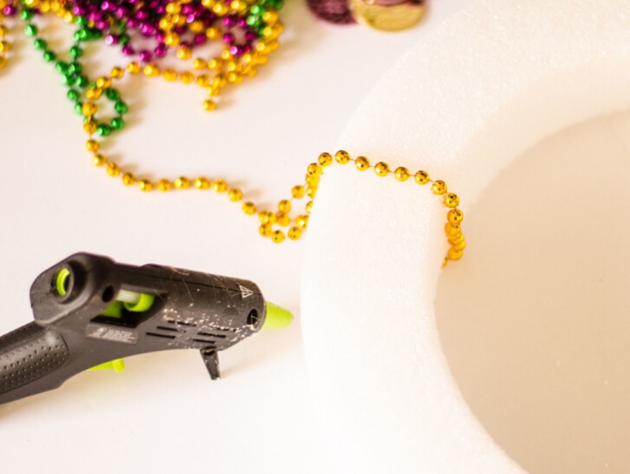 Begin by wrapping a single strand of beads from the Mardi Gras Beads Assortment around a White Foam Wreath and secure the strand using a Hot Glue Gun.