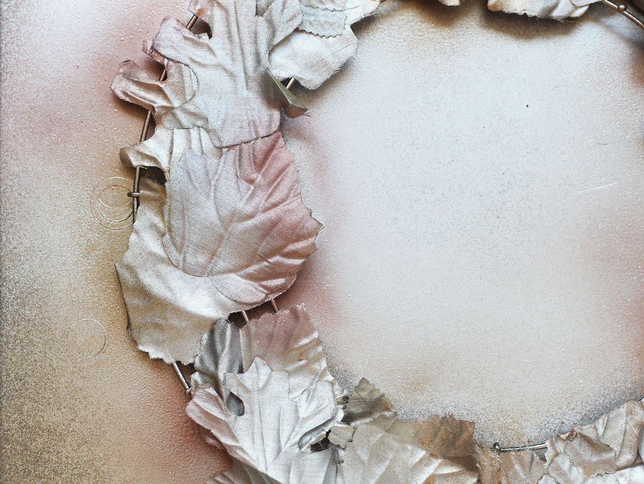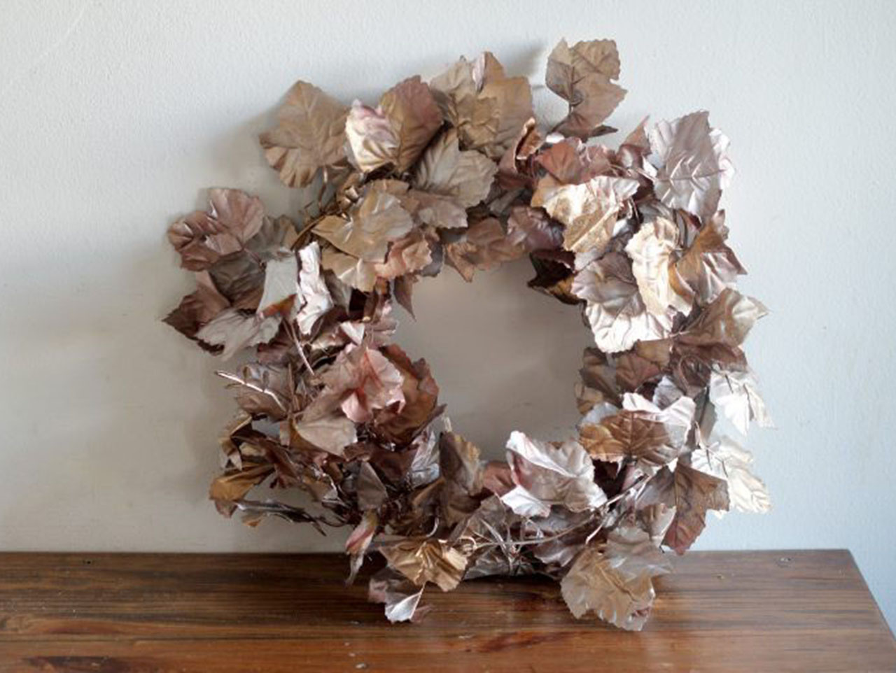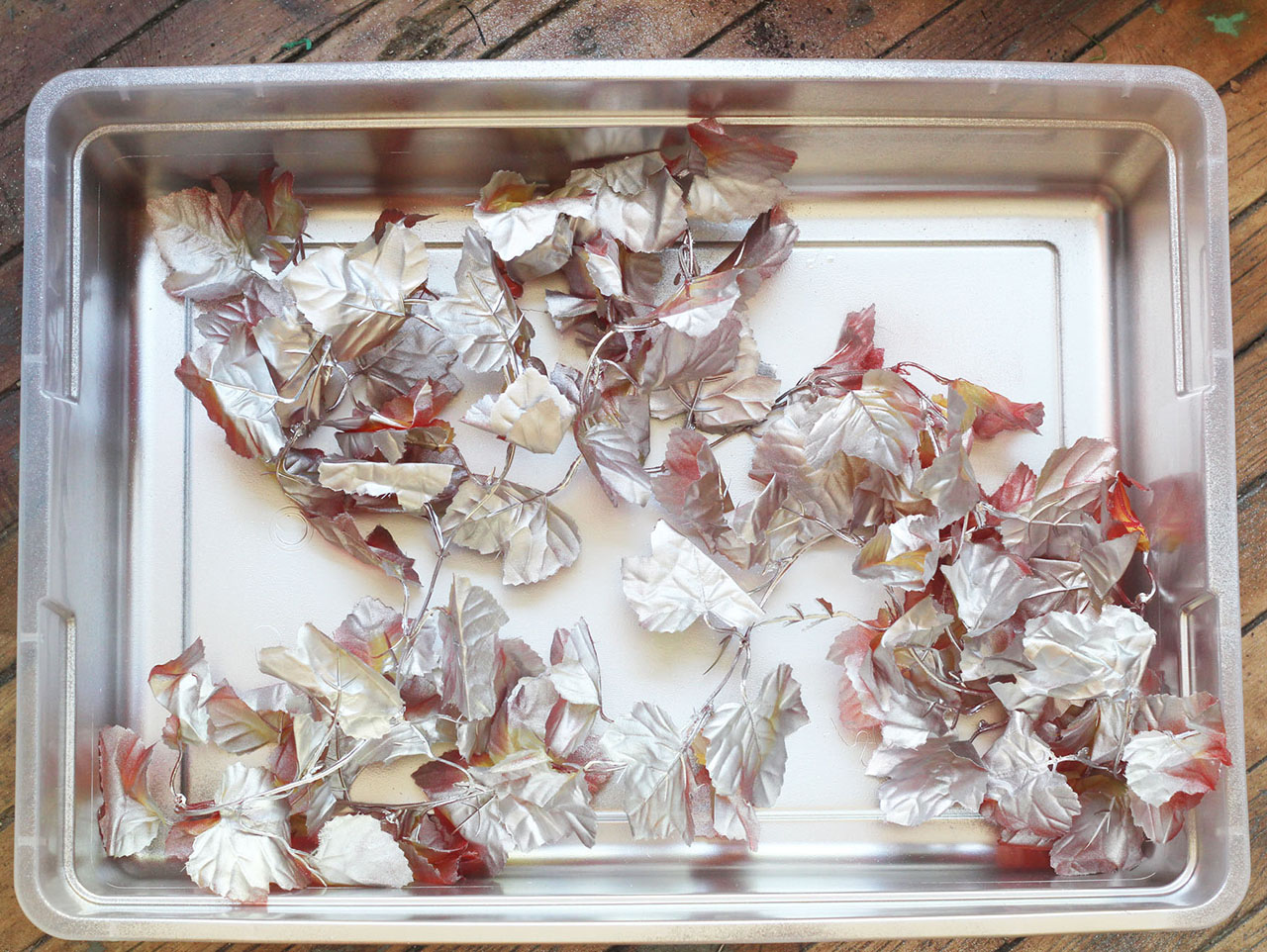 Place the wreath back in the plastic container and spray paint that second layer of leaves with a different metallic spray paint. Spray in small bursts to let some of the first color peek through. Set the wreath aside to dry.