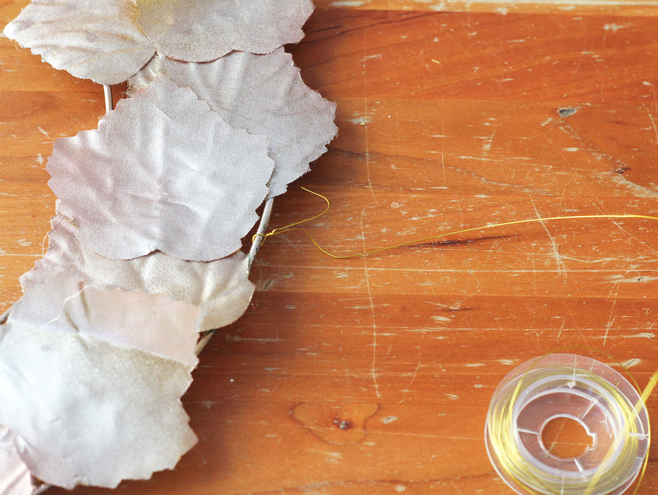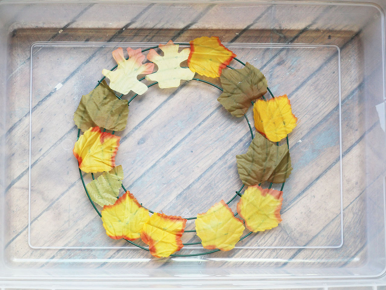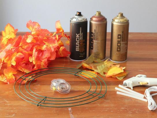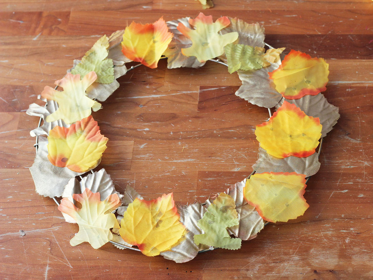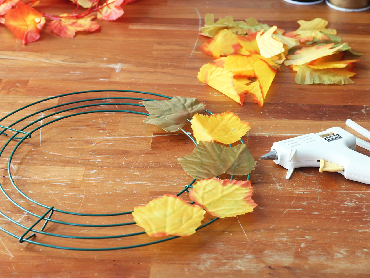 Hot glue the loose leaves onto the wreath frame. Try not to overlap the leaves.