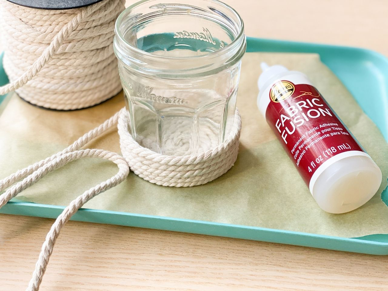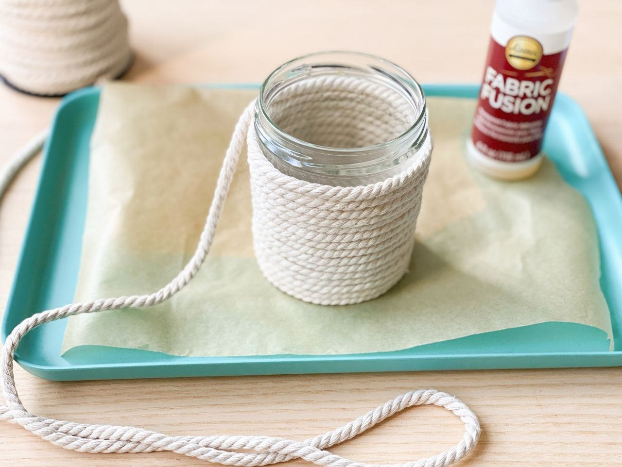 Keep coiling the rope until you get a round coaster-like shape that's about one rope-width wider than the bottom of your glass jar.