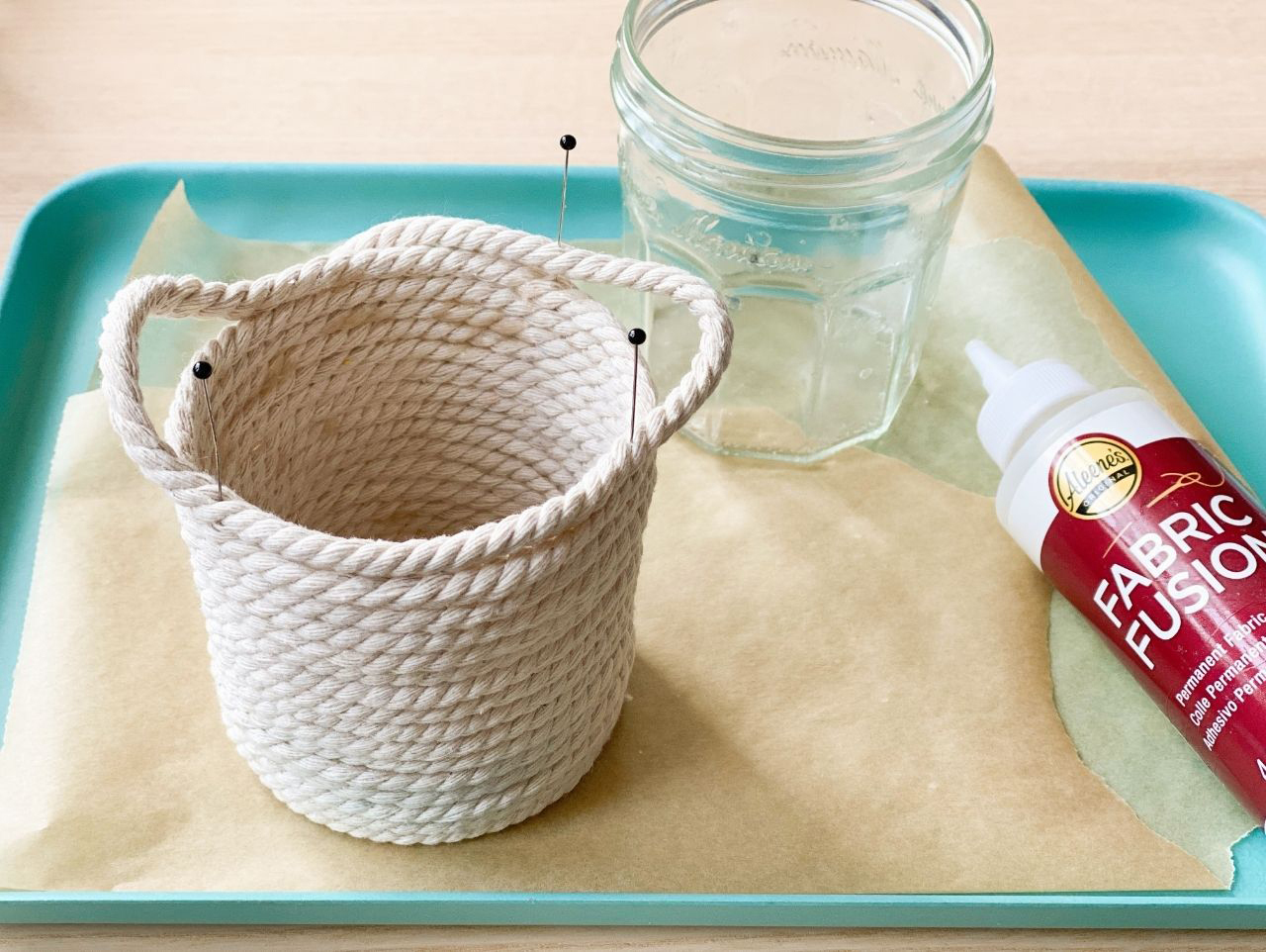 Once you remove the jar, it's time to make little basket handles. Instead of gluing the rope along the top edge as you've been doing, hold the rope up to make a handle and glue it down about 1 1/2 inches away. Insert a straight pin to hold in place. Repeat on the other side. Cut the rope and glue the end neatly on the back, tucked under one handle.