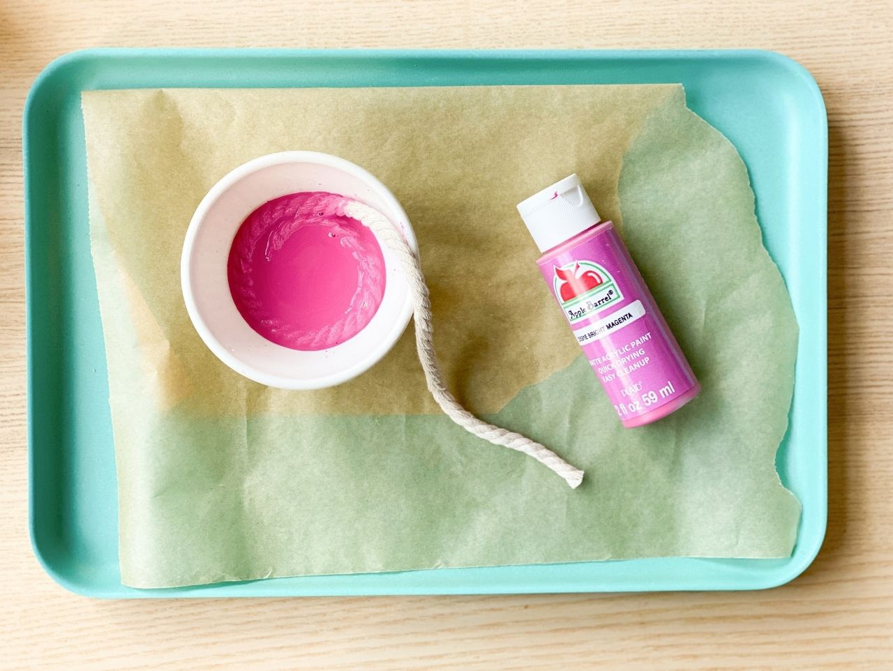 Mix a half of teaspoon of acryic paint with three tablespoons of water; mix until paint is evenly dispersed in the water. Cut a piece of rope (about six to eight inches long) and submerge in the liquid paint. Once it's saturated, squeeze out and lay flat or hang to dry.