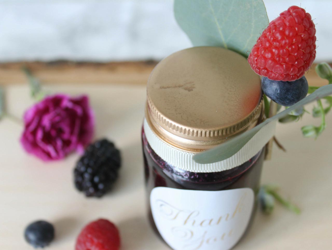 Your first step is to go back and follow our recipe for mixed berry jam! Fill the Mini Mason Favor Jars with the delicious spread! Next, take the spray paint and paint each of the mason jar lids gold. We love the way the gold looked next to the deep burgundy of the mixed berry jam. Once the lids have dried, place them back on the jars.