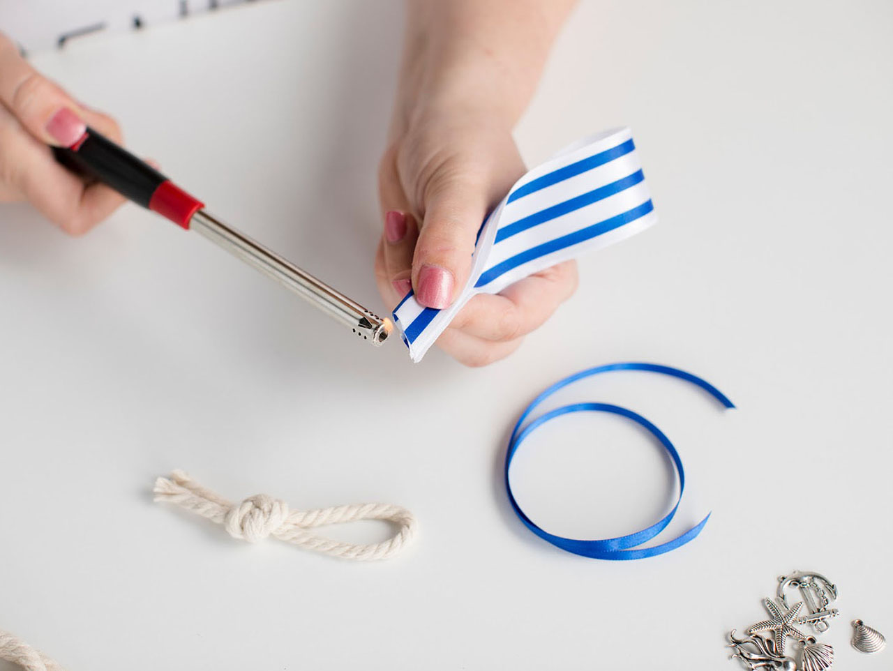 Next, tie a length of 5mm wide ribbon around the middle of the striped folded ribbon and use the lighter method to seal the ribbon ends.