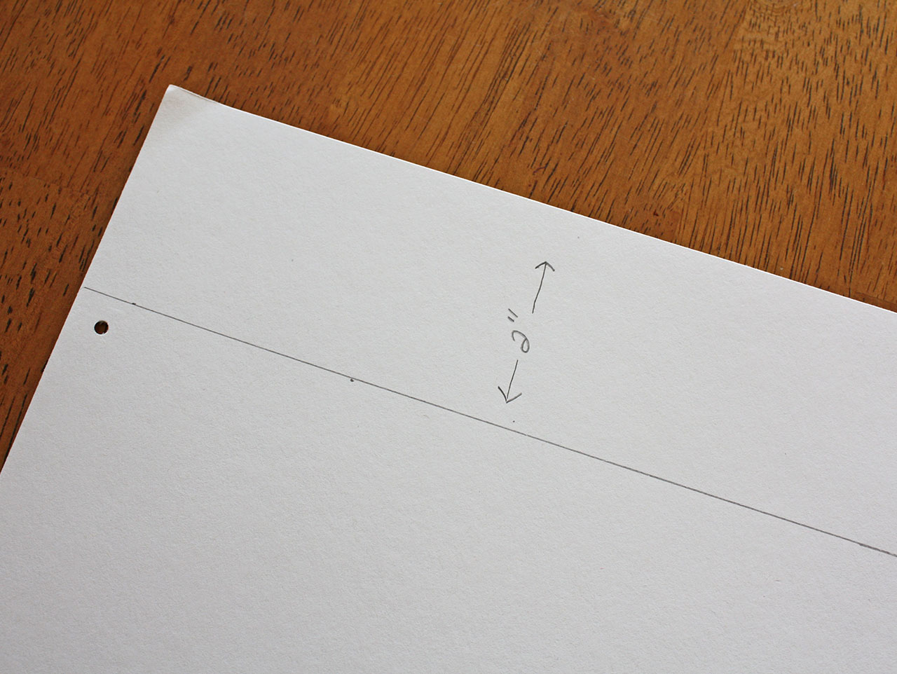 First, mark a few areas on our 9″ x 12″ piece of white construction paper. Start by drawing a line that is 2″ wide across the top of the white 9″ x 12″ paper. It should be 2″ wide and 12″ in length. Punch a small hole on each end of the line you drew, just below the line.
