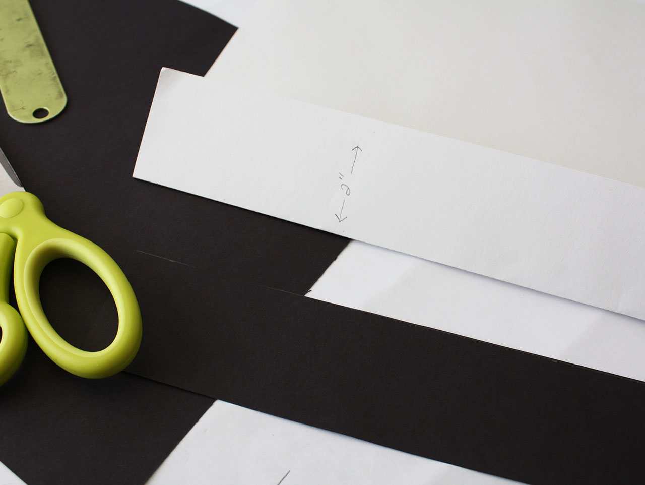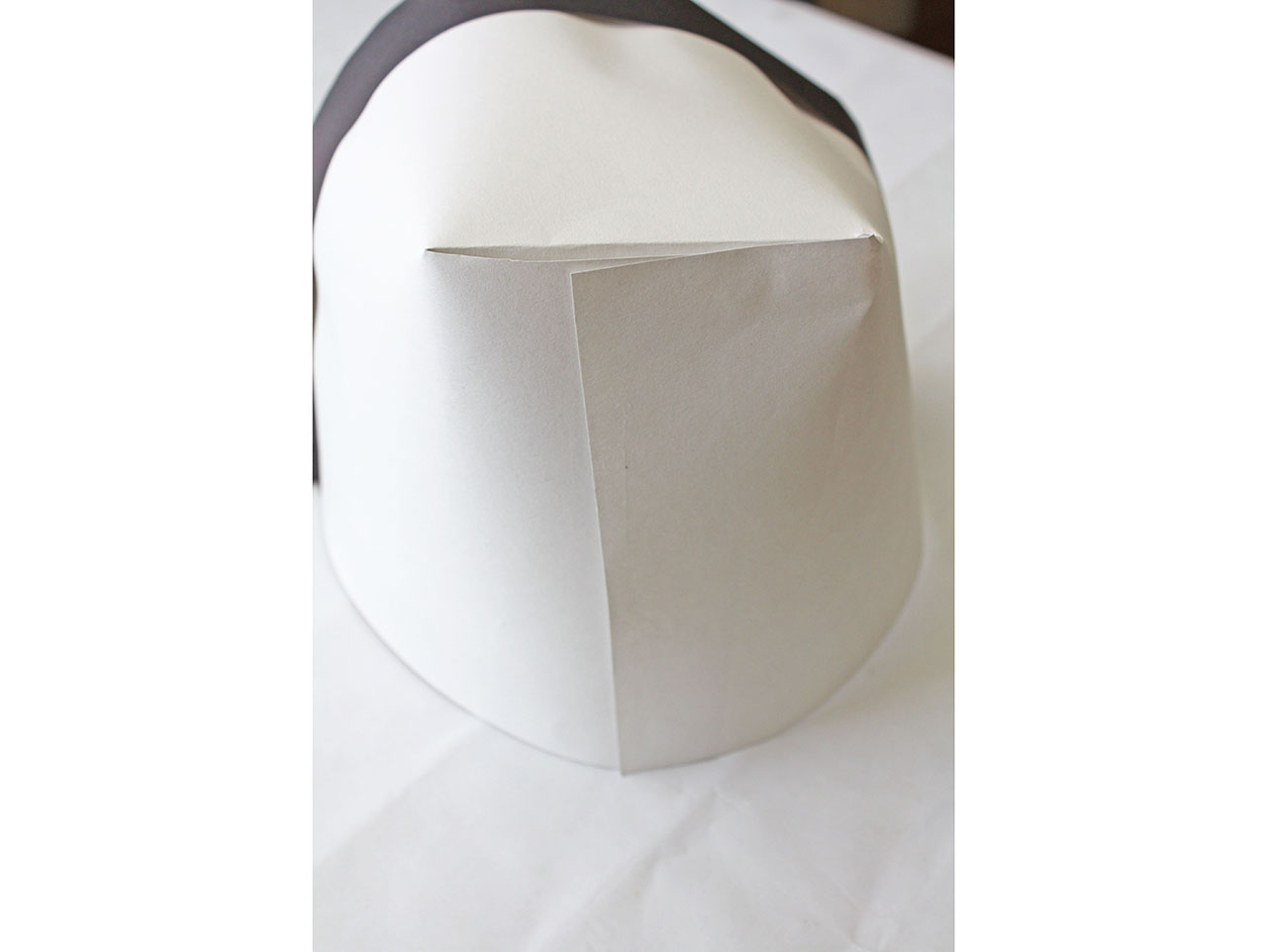 Cut a black rectangle from black construction paper that is 2×12″. Glue this strip on top of the 2×12″ rectangle you made at the top of the white paper. This will be the rim of the bonnet. Fold over the 2″ rectangle portion.
