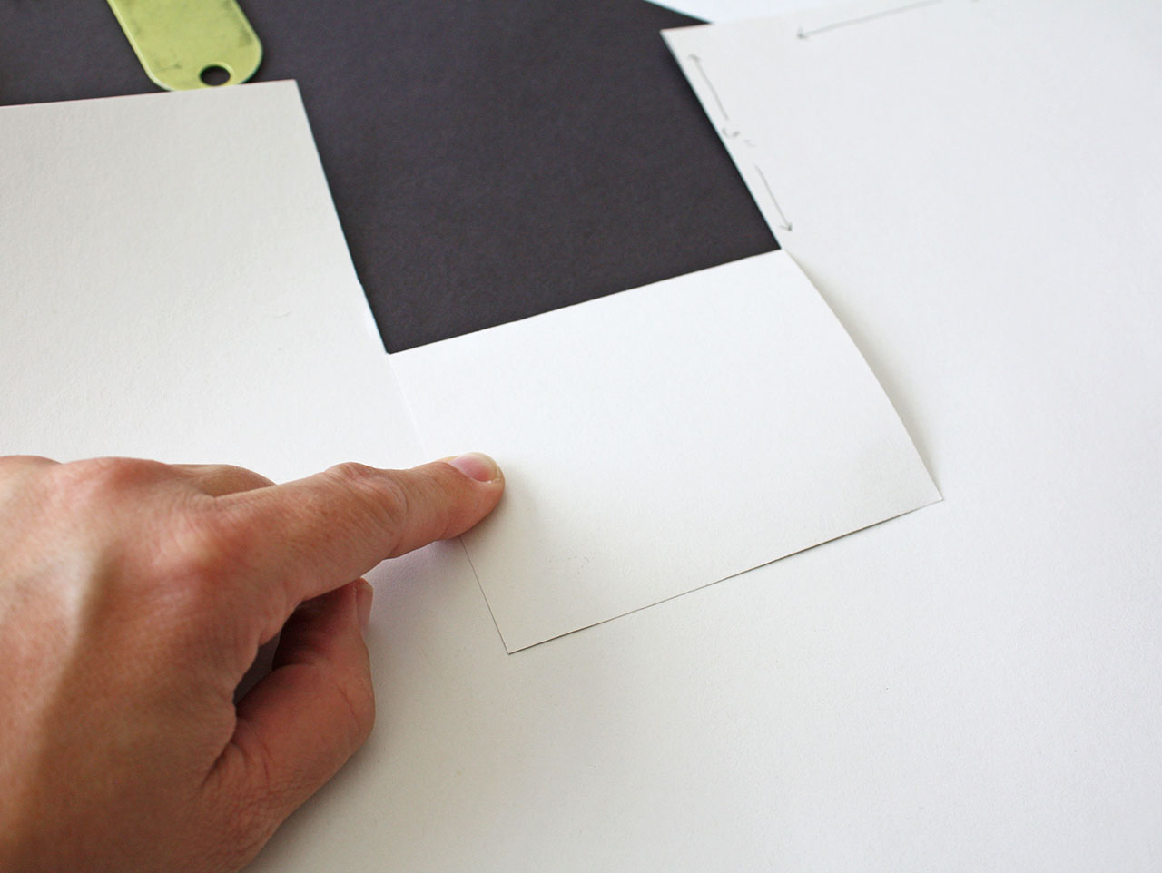 Using the scissors, cut both of the 3″ lines at the bottom of the white paper you marked. Fold over the square.