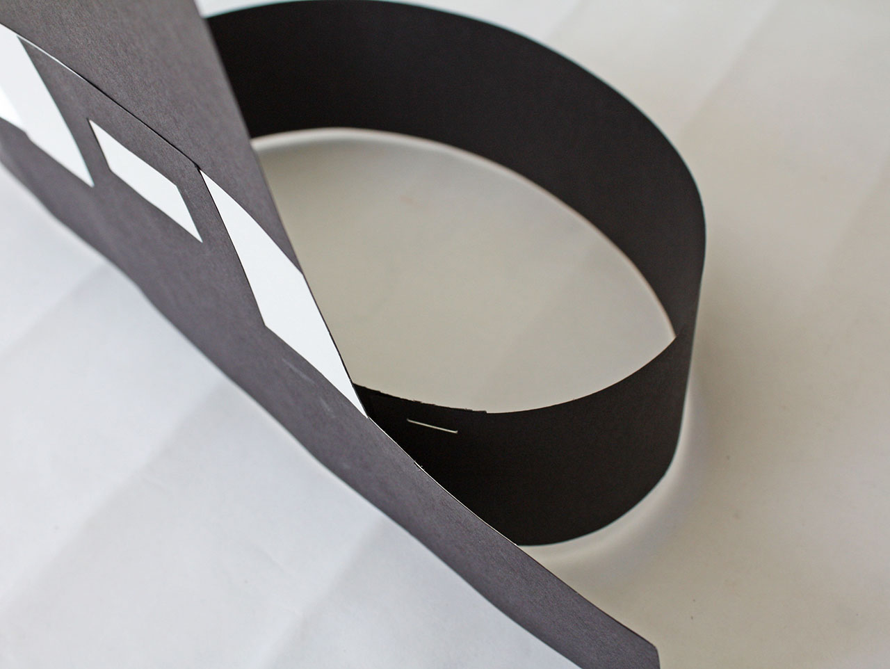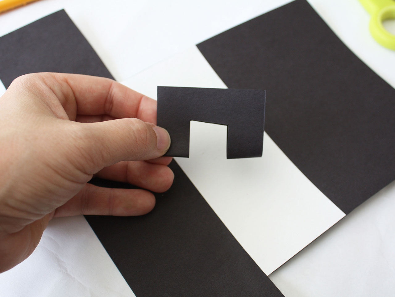 Cut a small black rectangle to be the hat buckle. Fold the rectangle in half and cut a small square from it on the folded edge. Glue the buckle to the center of the white rectangle.