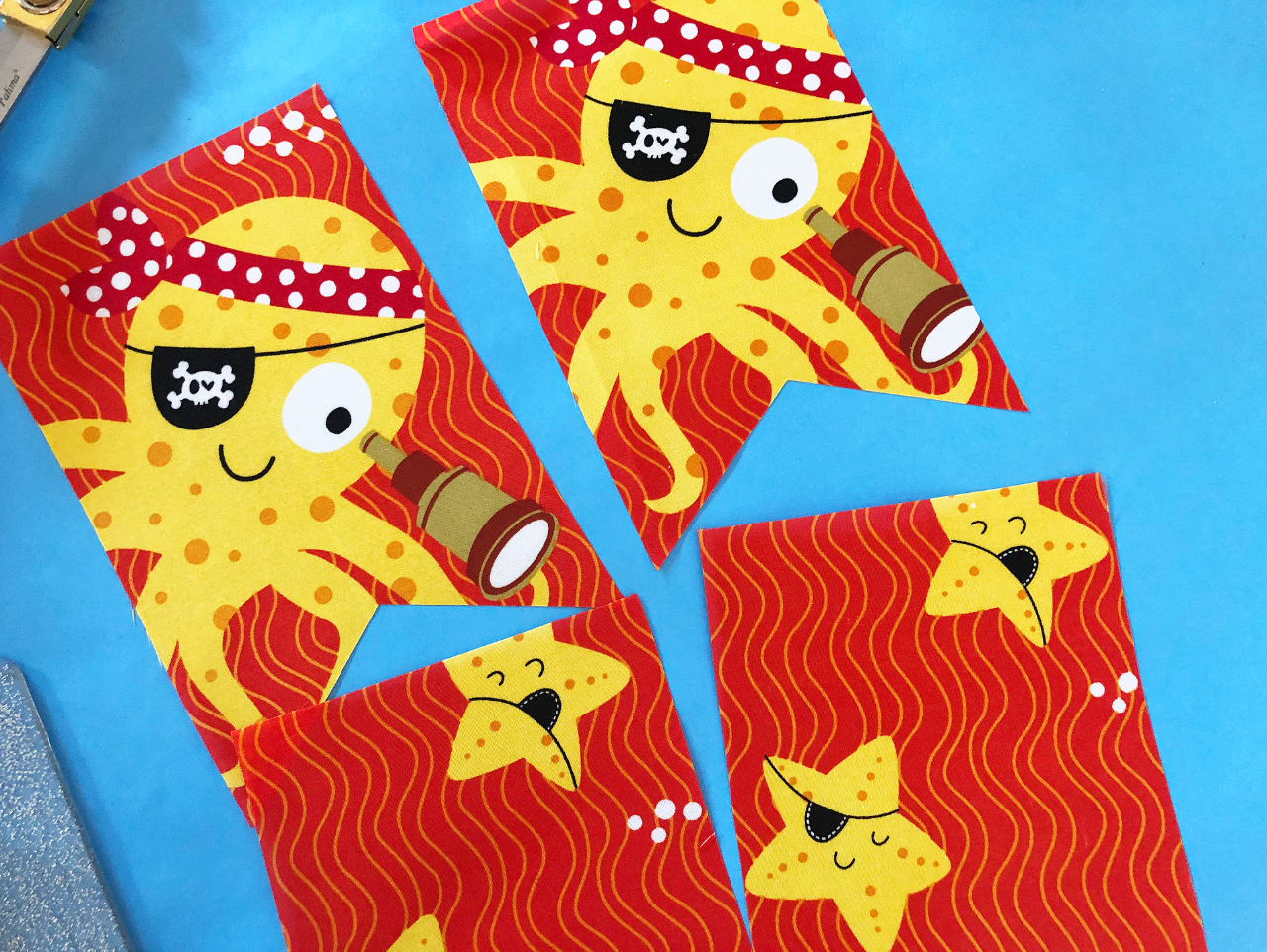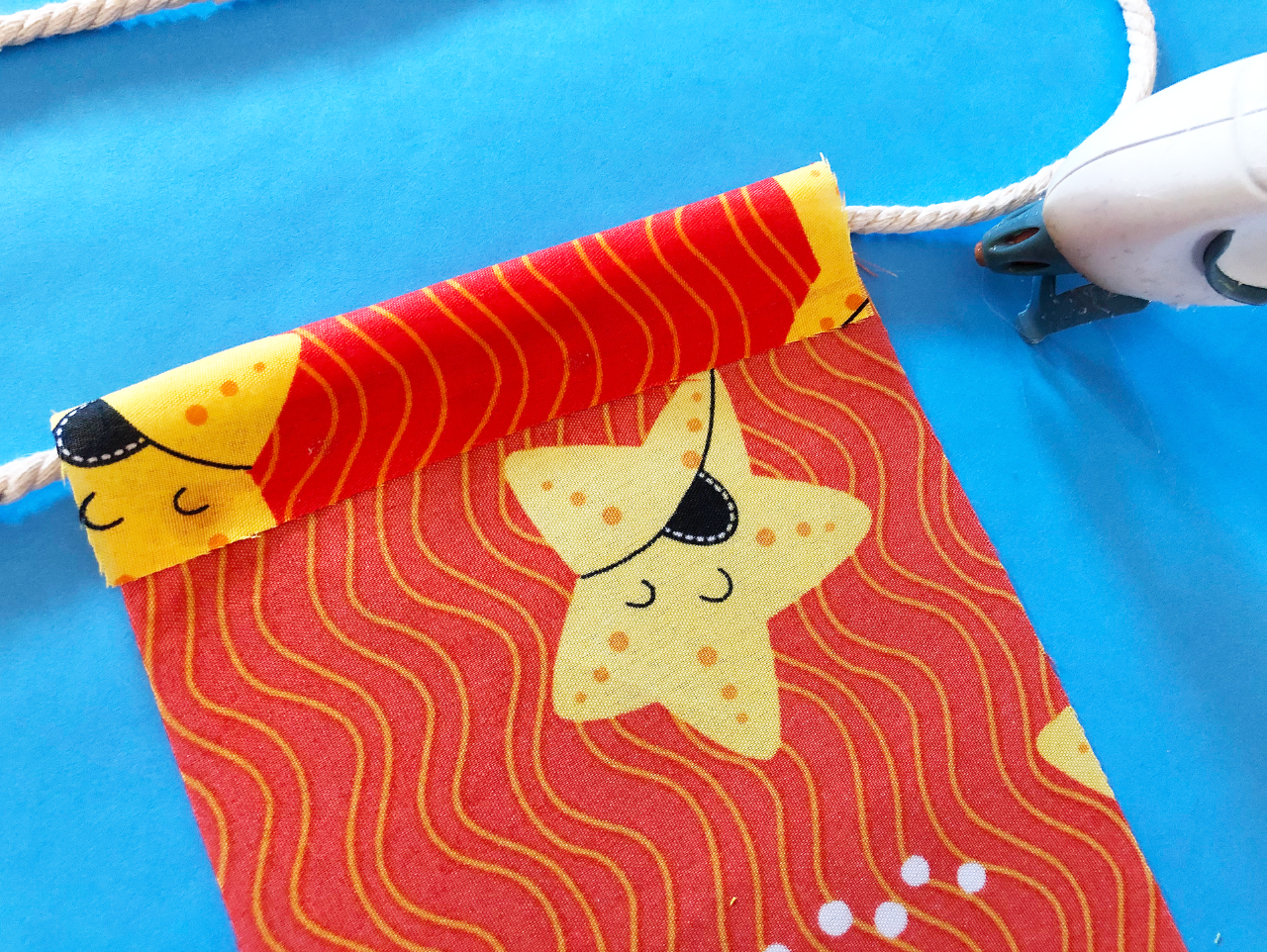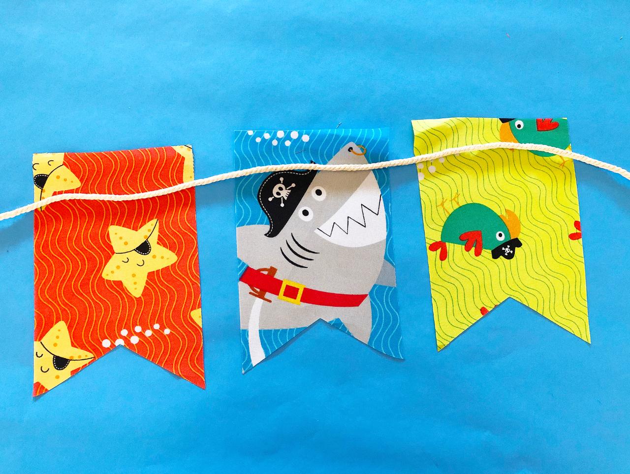 Now it's time to hang up your creation! This vibrant fabric banner will look great at your child's Pirate Animals Birthday Party and can be reused to decorate their bedroom or playroom!