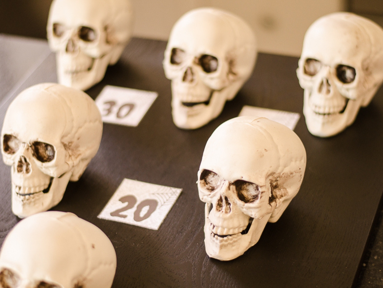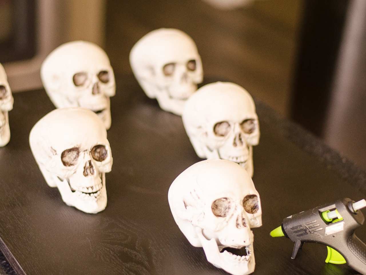 Paint a wood sign using black acrylic paint and set aside to dry. Next, hot glue 5 skulls to the painted board. Place one skull towards the front of the board, two skulls in the middle and three towards the back.