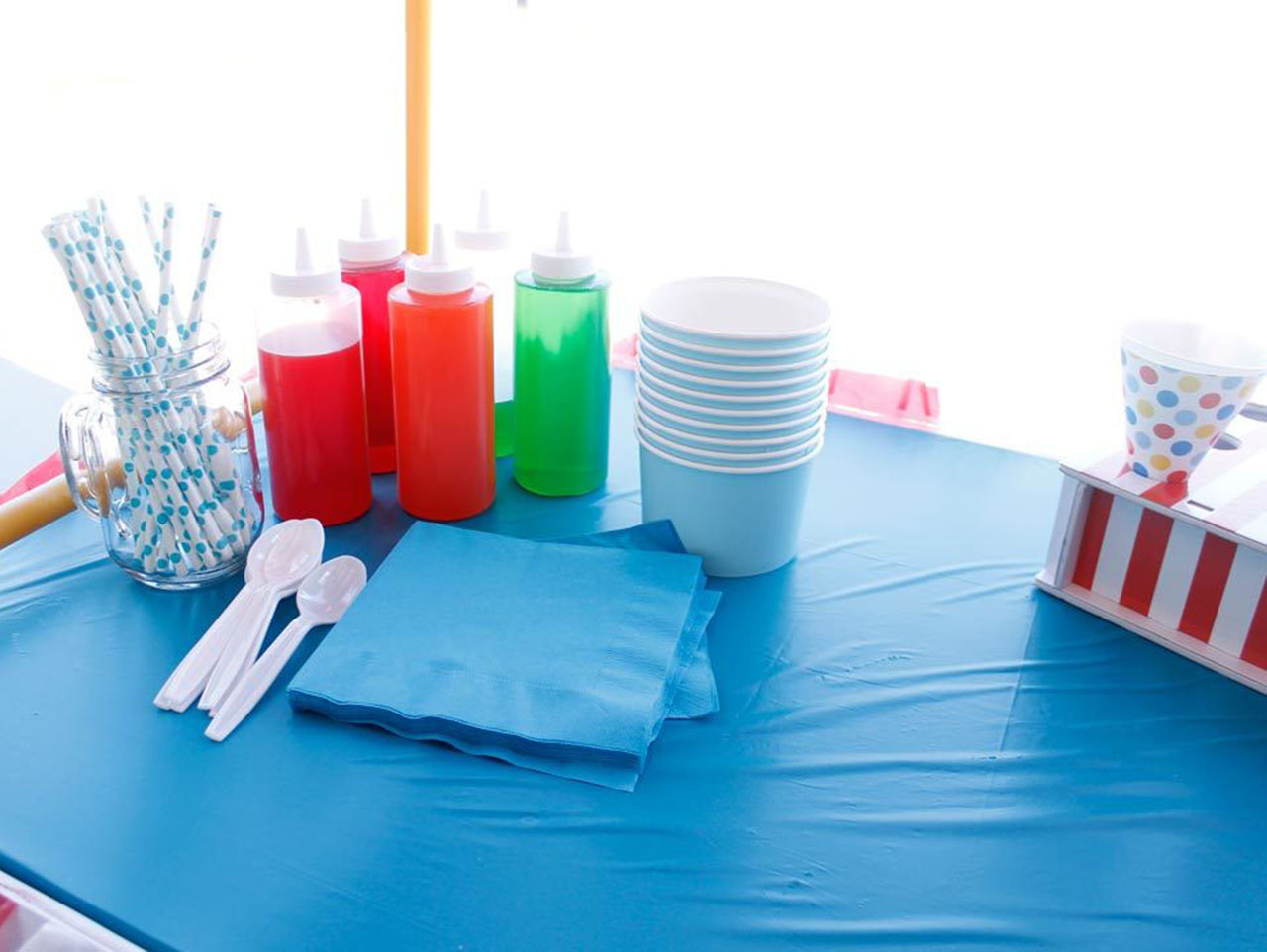 The other side of our stand held the supplies. Having the supplies like, Turquoise Napkins, Turquoise Polka Dot Paper Straws, Spoons, and flavored syrups right there made things move pretty quickly. It also helped keep the messes minimal.
